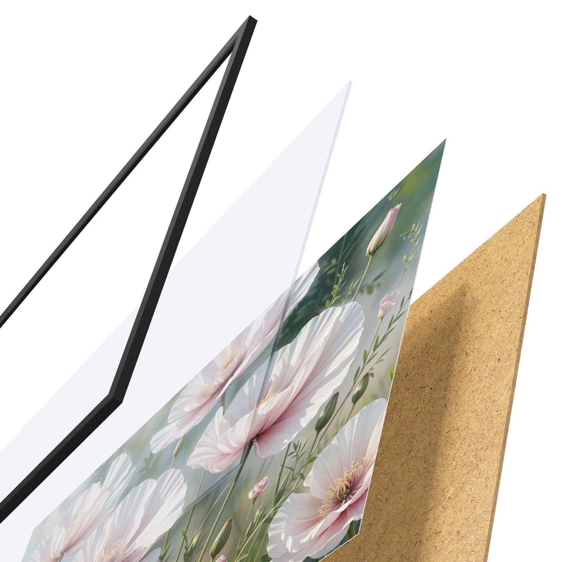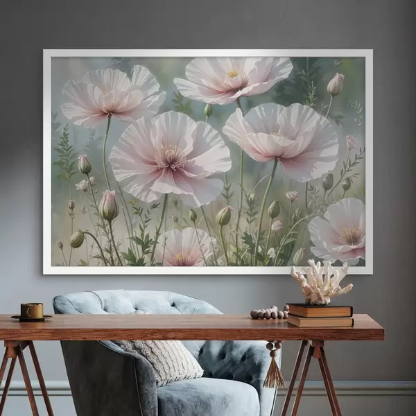 Plakatas Švelnių, šviesiai rausvų aguonų žiedų laukas su minkštais, švelniais žiedlapiais neryškiame žaliame fone f41094
