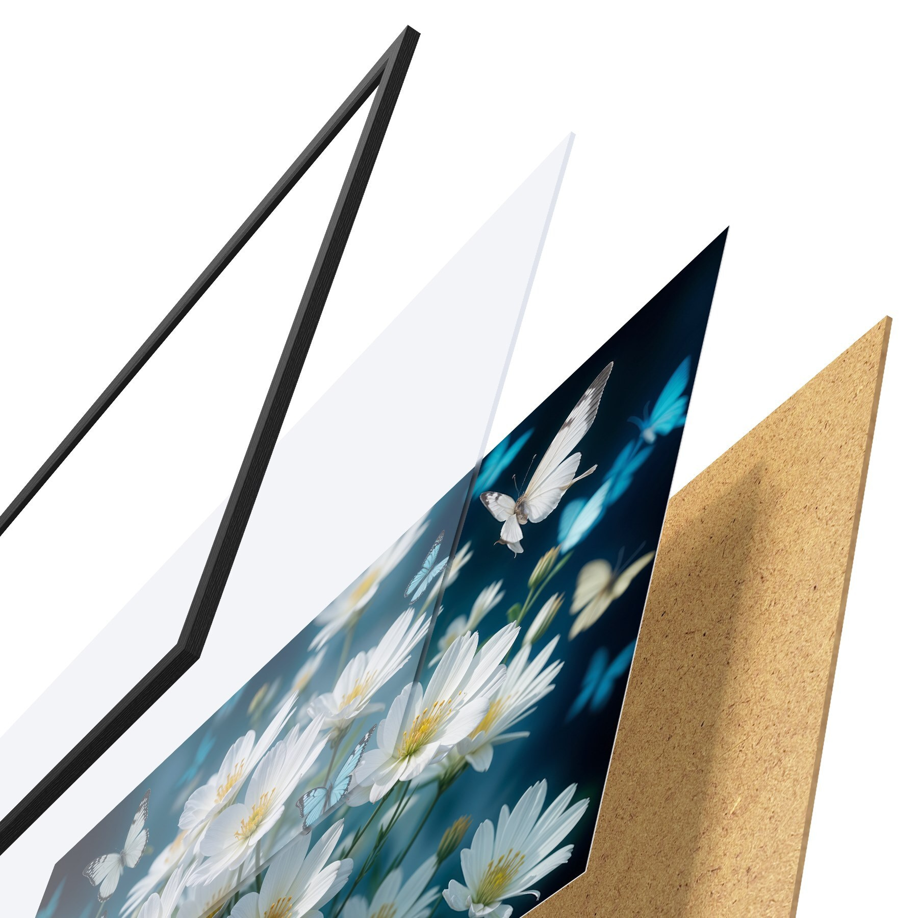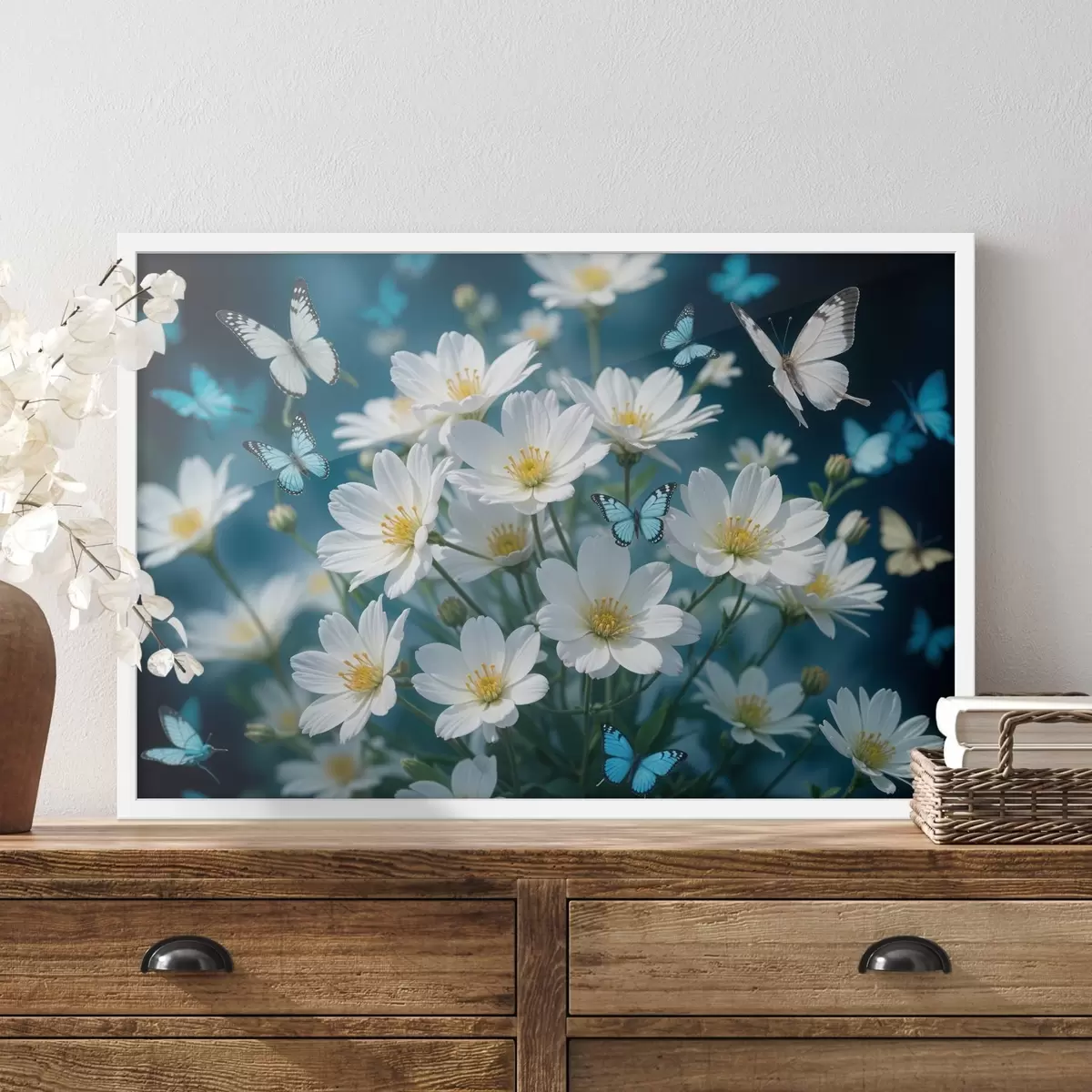 Plakatas Baltų margučių žiedų laukas su tarp jų skraidančiais mėlynais drugeliais neryškiame mėlyname fone f41096