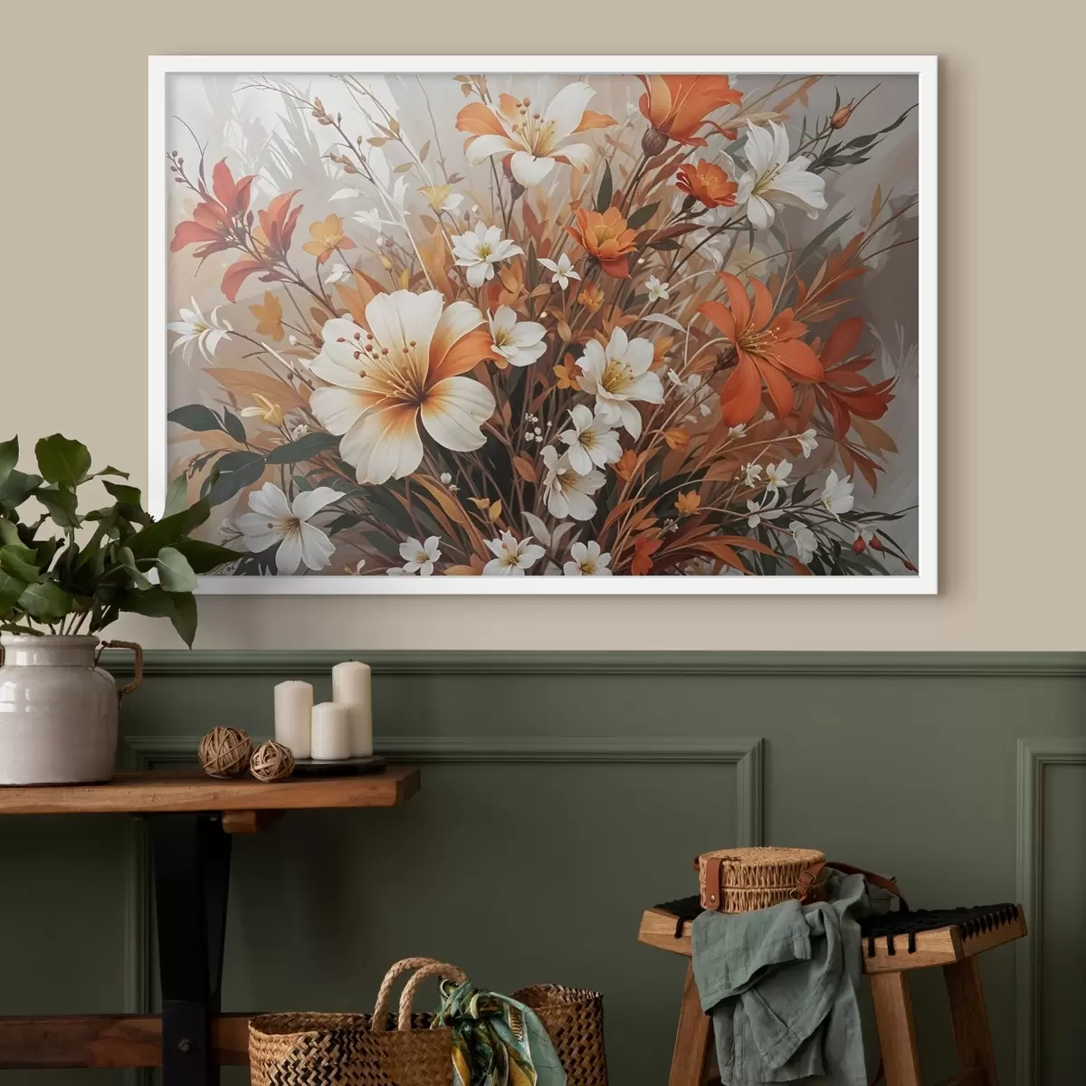 Plakatas Ryški oranžinių ir baltų gėlių puokštė, įskaitant lelijas ir kitus švelnius žiedus f41099