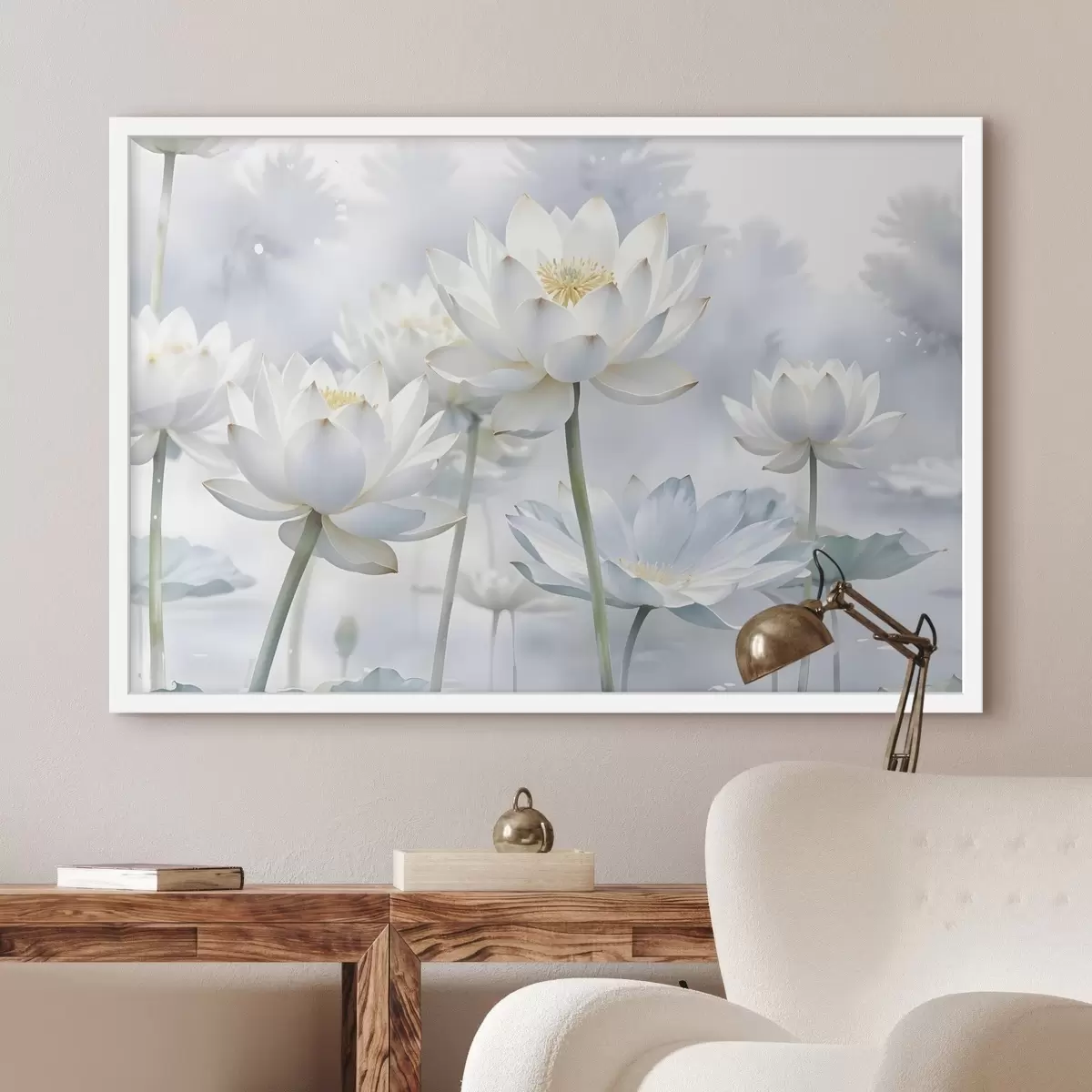 Plakatas Baltos pastelinės spalvos lotoso gėlės miglotame abstrakčiame akvareliniame fone f41100