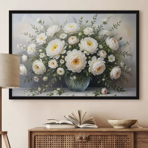 Plakatas Gražių baltų ir geltonų rožių puokštė vazoje, apsupta žalumos ir smulkių baltų gėlių Ne f41101