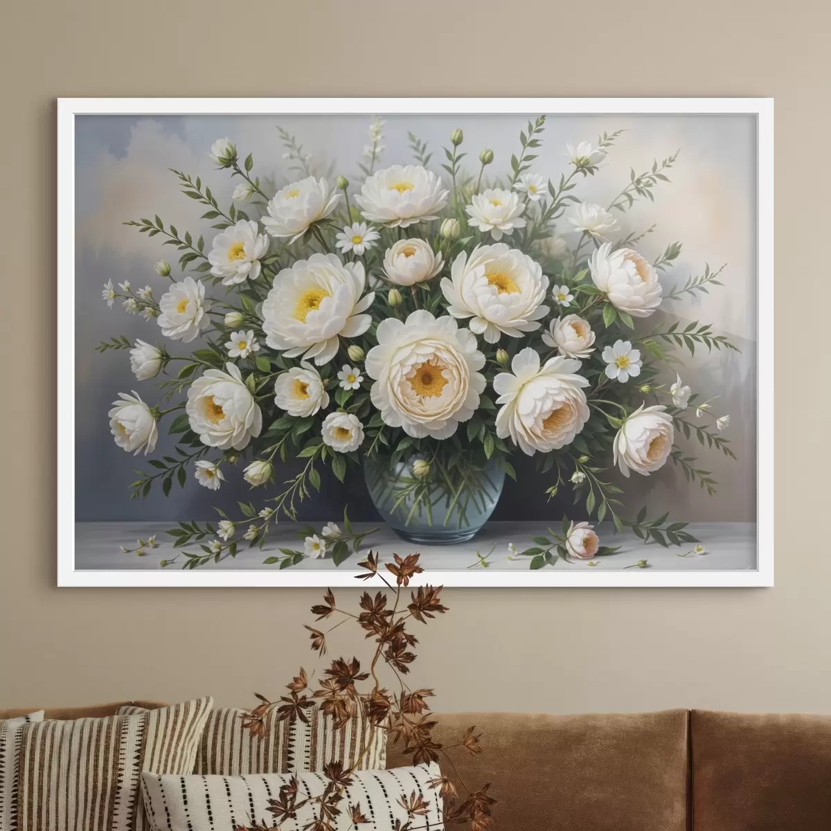 Plakatas Gražių baltų ir geltonų rožių puokštė vazoje, apsupta žalumos ir smulkių baltų gėlių f41101