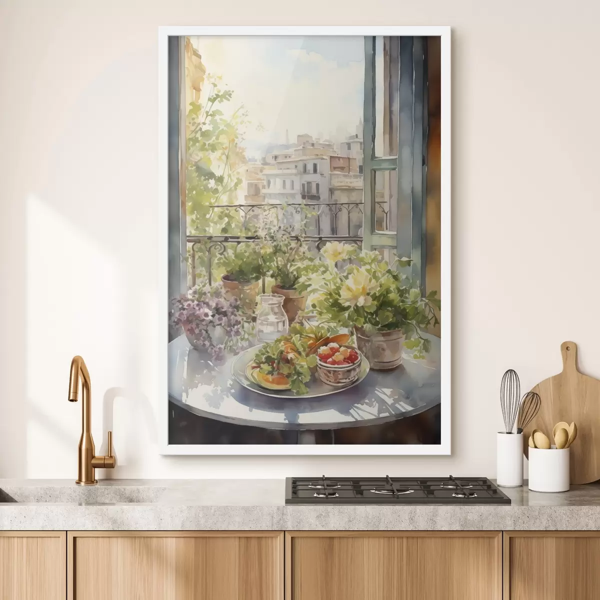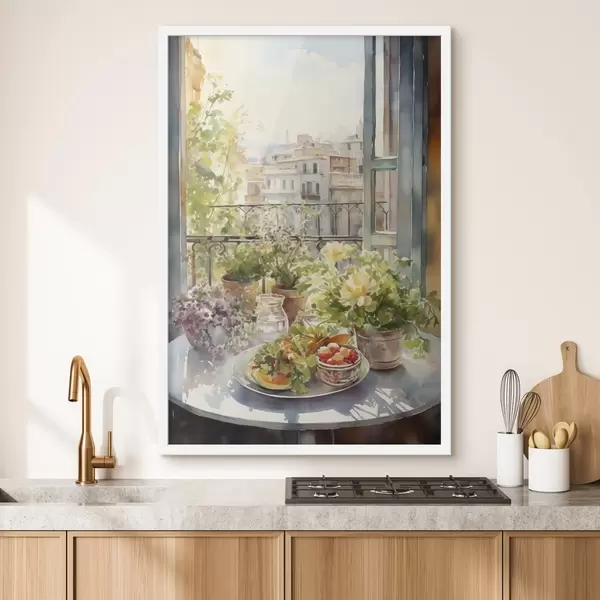 Plakatas Romantiška vakarienė su vaizdu į miestą, akvarelė, gėlės Ne f41168