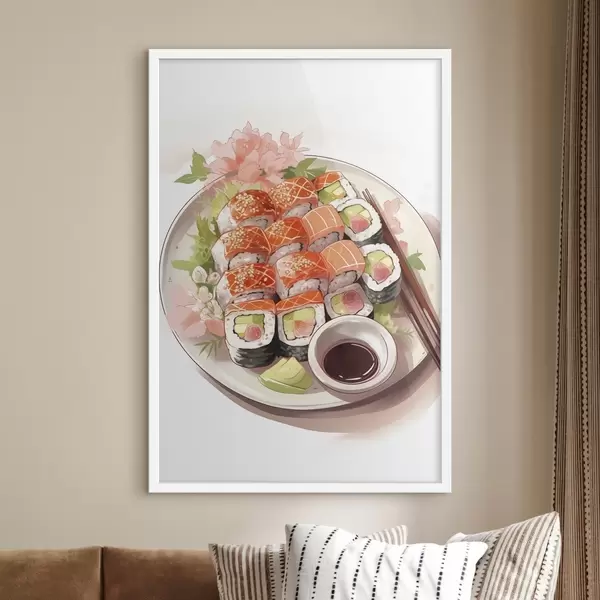 Plakatas Akvarelinė lėkštė su sušiais, lašiša, skanus Ne f41180