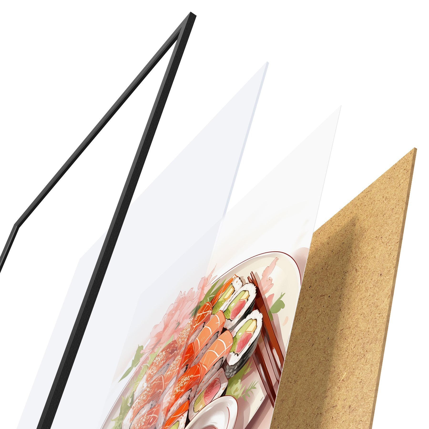 Plakatą sudaro rėmas, pleksiklas, atspausdintas vaizdas ir medžio drožlių plokštės pagrindas. Plakatą galima iš karto pakabinti ant sienos dėl kitoje pusėje esančių laikiklių.