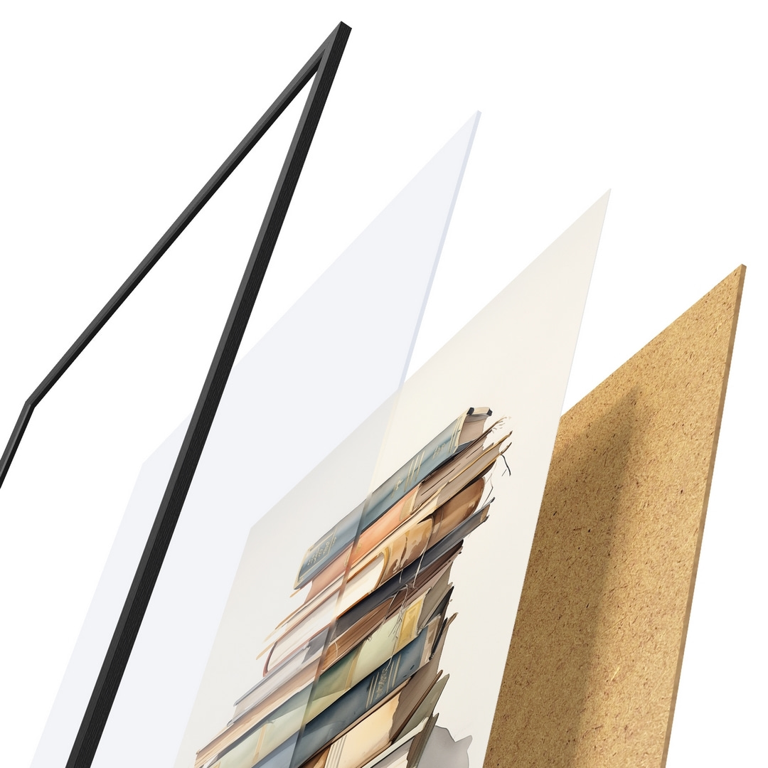 Plakatą sudaro rėmas, pleksiklas, atspausdintas vaizdas ir medžio drožlių plokštės pagrindas. Plakatą galima iš karto pakabinti ant sienos dėl kitoje pusėje esančių laikiklių.