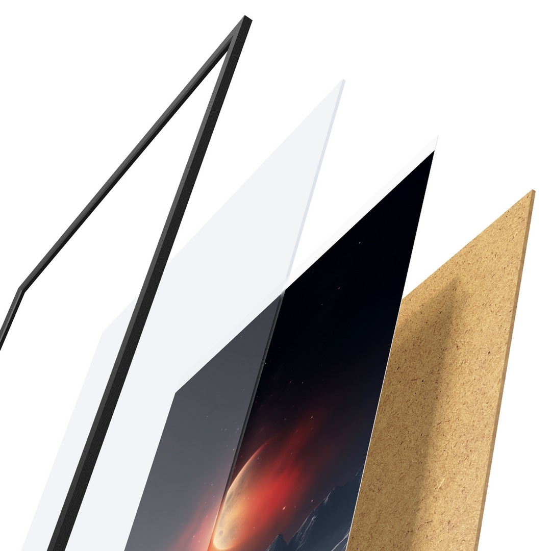 Plakatą sudaro rėmas, pleksiklas, atspausdintas vaizdas ir medžio drožlių plokštės pagrindas. Plakatą galima iš karto pakabinti ant sienos dėl kitoje pusėje esančių laikiklių.