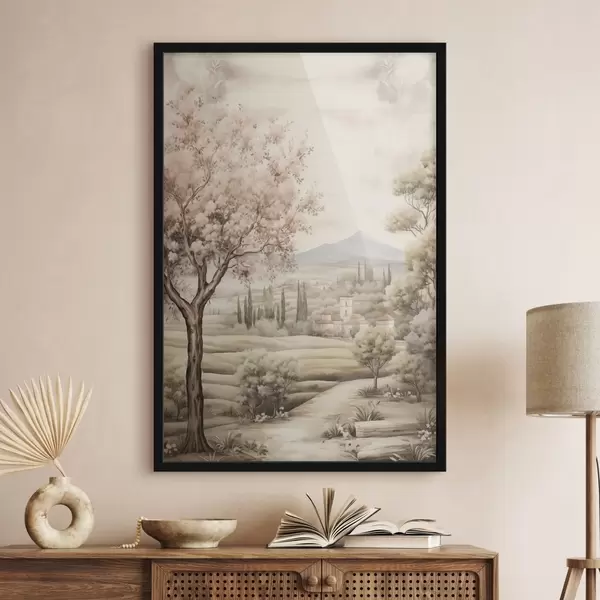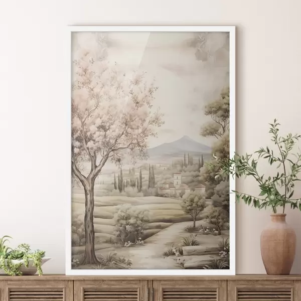 Plakatas Akvarelės kalvos, žydinčios vyšnios, pilis, kaimiškas stilius f41225