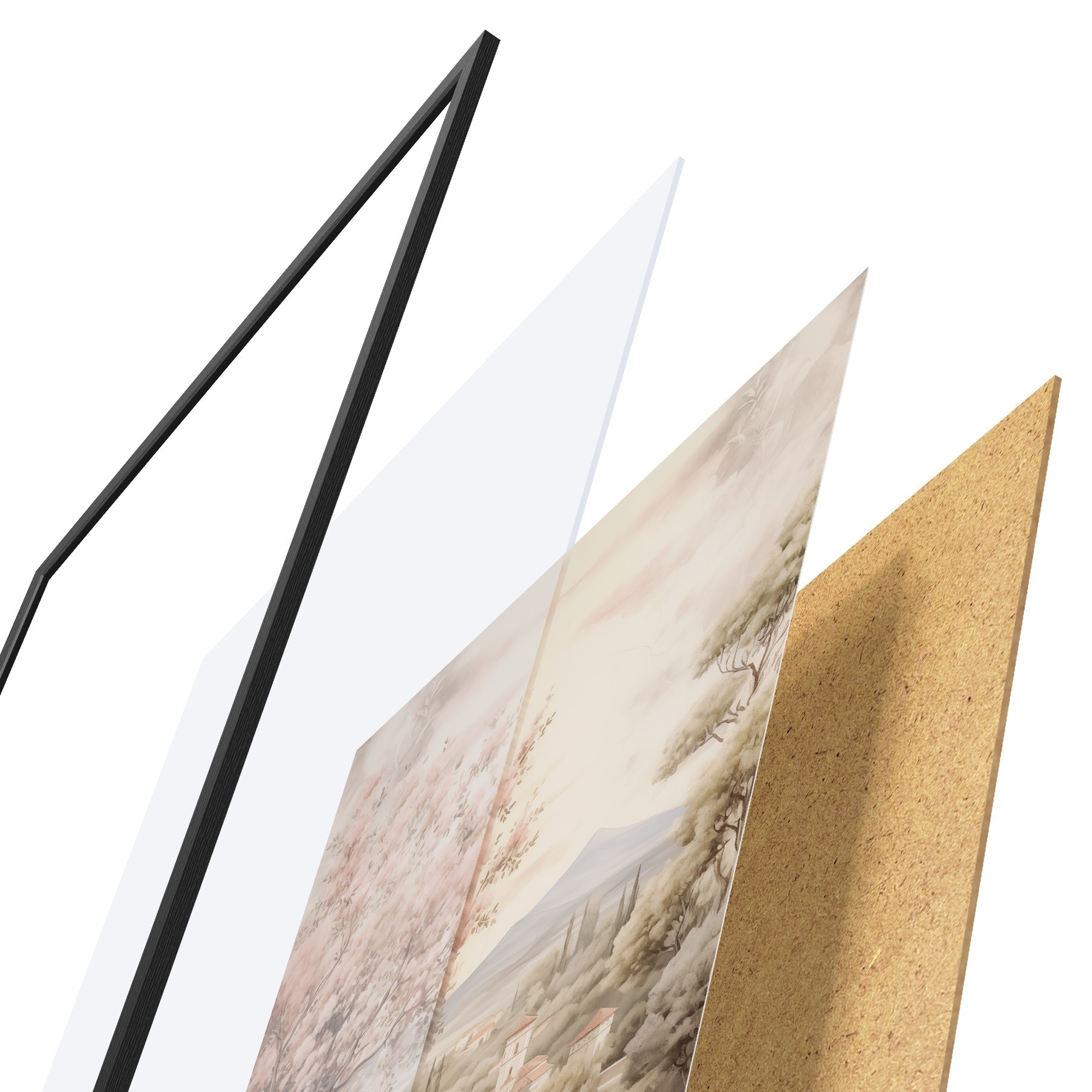 Plakatą sudaro rėmas, pleksiklas, atspausdintas vaizdas ir medžio drožlių plokštės pagrindas. Plakatą galima iš karto pakabinti ant sienos dėl kitoje pusėje esančių laikiklių.