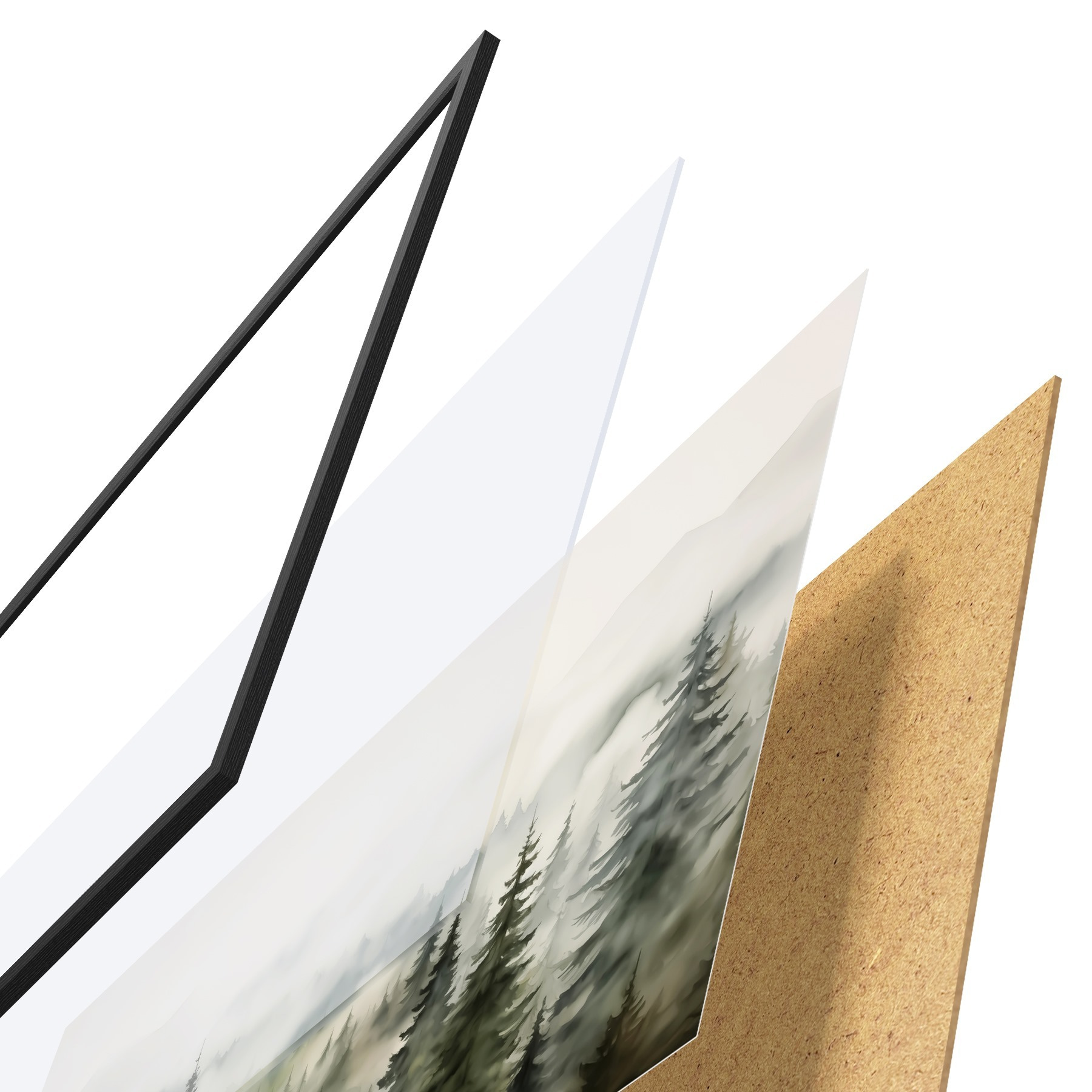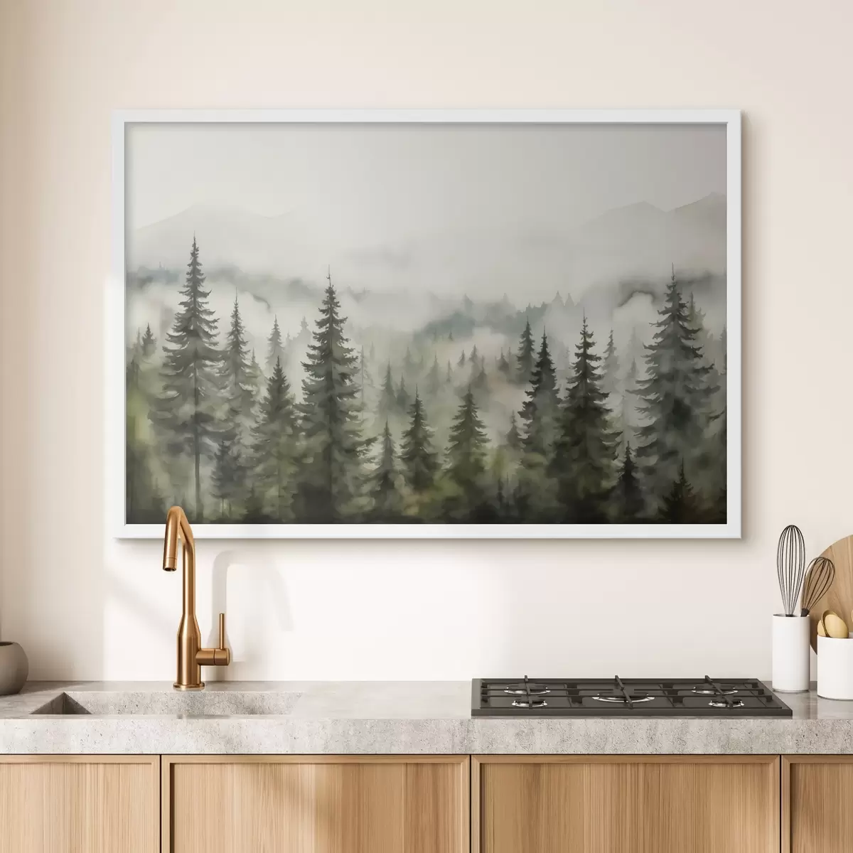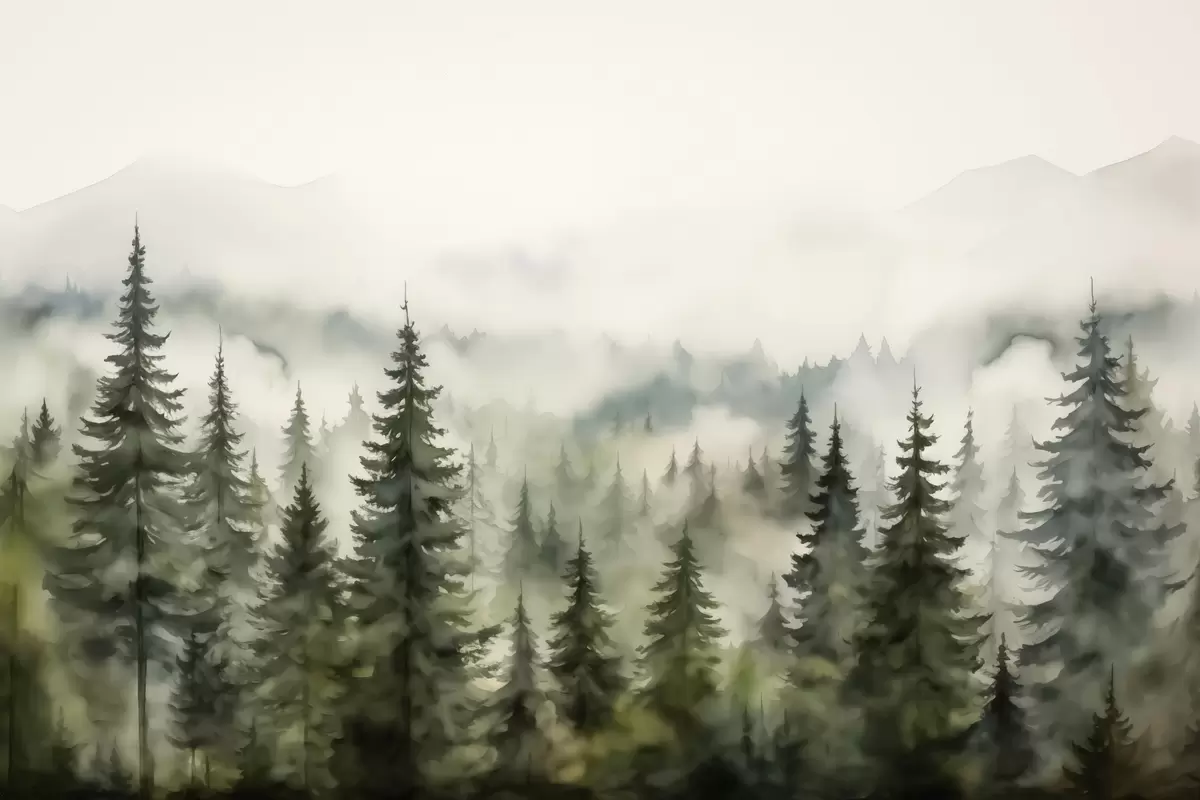 Plakatas Žalias miškas kalnų ir rūko fone akvarelė f41241