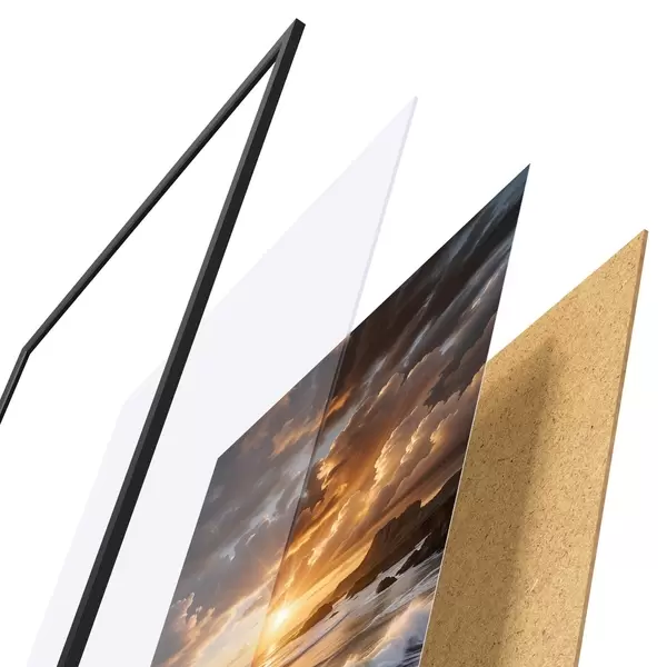 Plakatą sudaro rėmas, pleksiklas, atspausdintas vaizdas ir medžio drožlių plokštės pagrindas. Plakatą galima iš karto pakabinti ant sienos dėl kitoje pusėje esančių laikiklių.