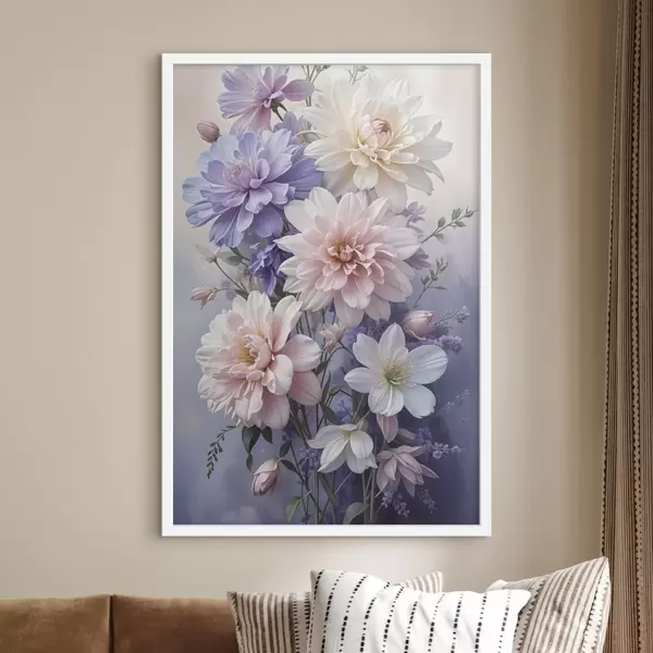 Plakatas Didelių, gyvybingų rausvų, levandų ir baltų jurginų žiedų puokštė švelniame, neryškiame fone f41247
