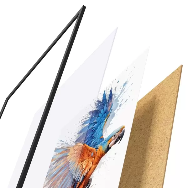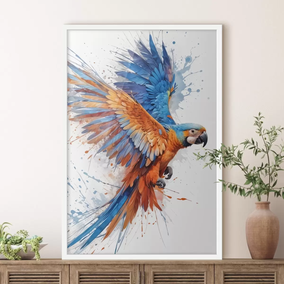 Plakatas Spalvinga papūga su ryškiomis mėlynomis, oranžinėmis ir geltonomis plunksnomis skrenda purslų fone Ne f41250