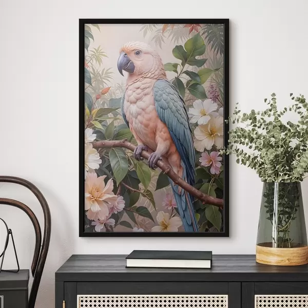 Plakatas Spalvinga papūga rausvomis, mėlynomis ir pilkomis plunksnomis, įsitaisiusi ant šakos atogrąžų gėlių ir lapų apsuptyje f41251