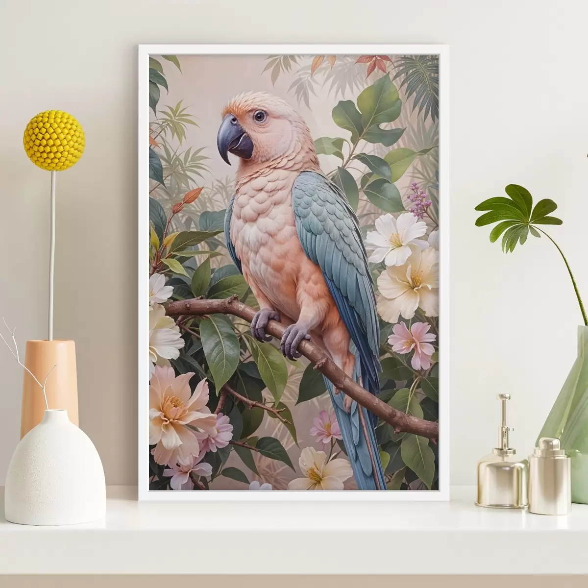 Plakatas Spalvinga papūga rausvomis, mėlynomis ir pilkomis plunksnomis, įsitaisiusi ant šakos atogrąžų gėlių ir lapų apsuptyje Ne f41251