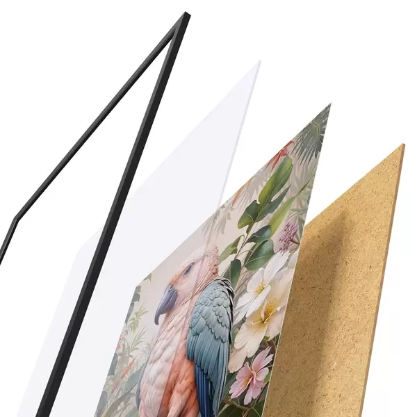 Plakatą sudaro rėmas, pleksiklas, atspausdintas vaizdas ir medžio drožlių plokštės pagrindas. Plakatą galima iš karto pakabinti ant sienos dėl kitoje pusėje esančių laikiklių.