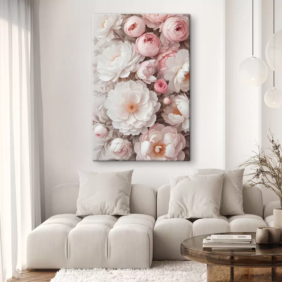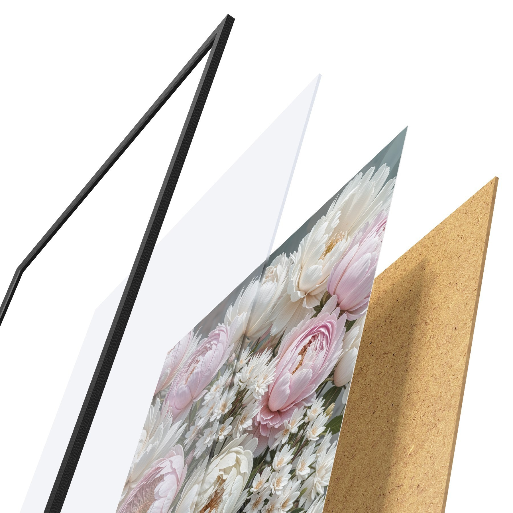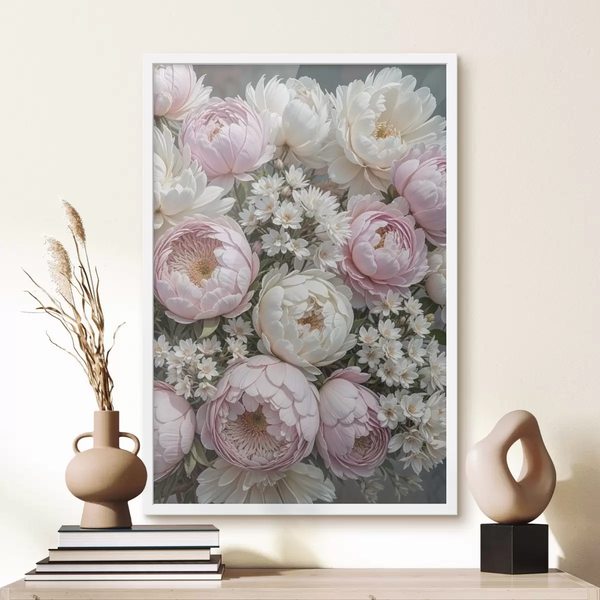 Plakatas Puokštė iš pastelinių rausvų bijūnų ir baltų margučių, sukomponuota į gražią gėlių kompoziciją f41255
