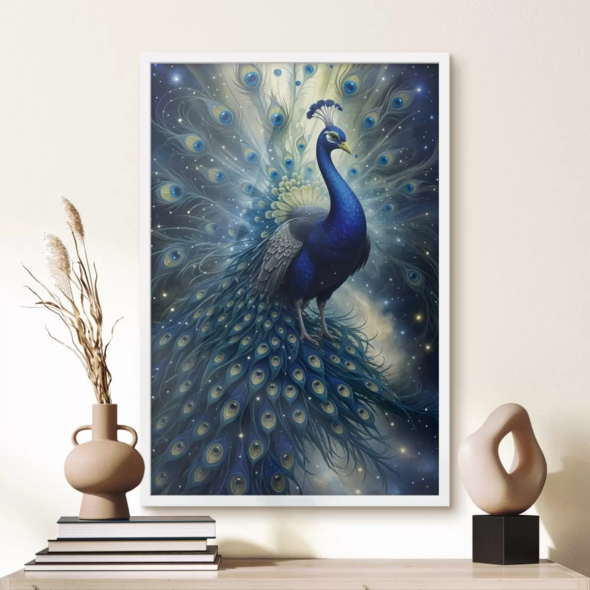Plakatas Ryškus ir didingas povas žvaigždėto nakties dangaus fone, sukuriantis stebuklingą ir nežemišką atmosferą f41256