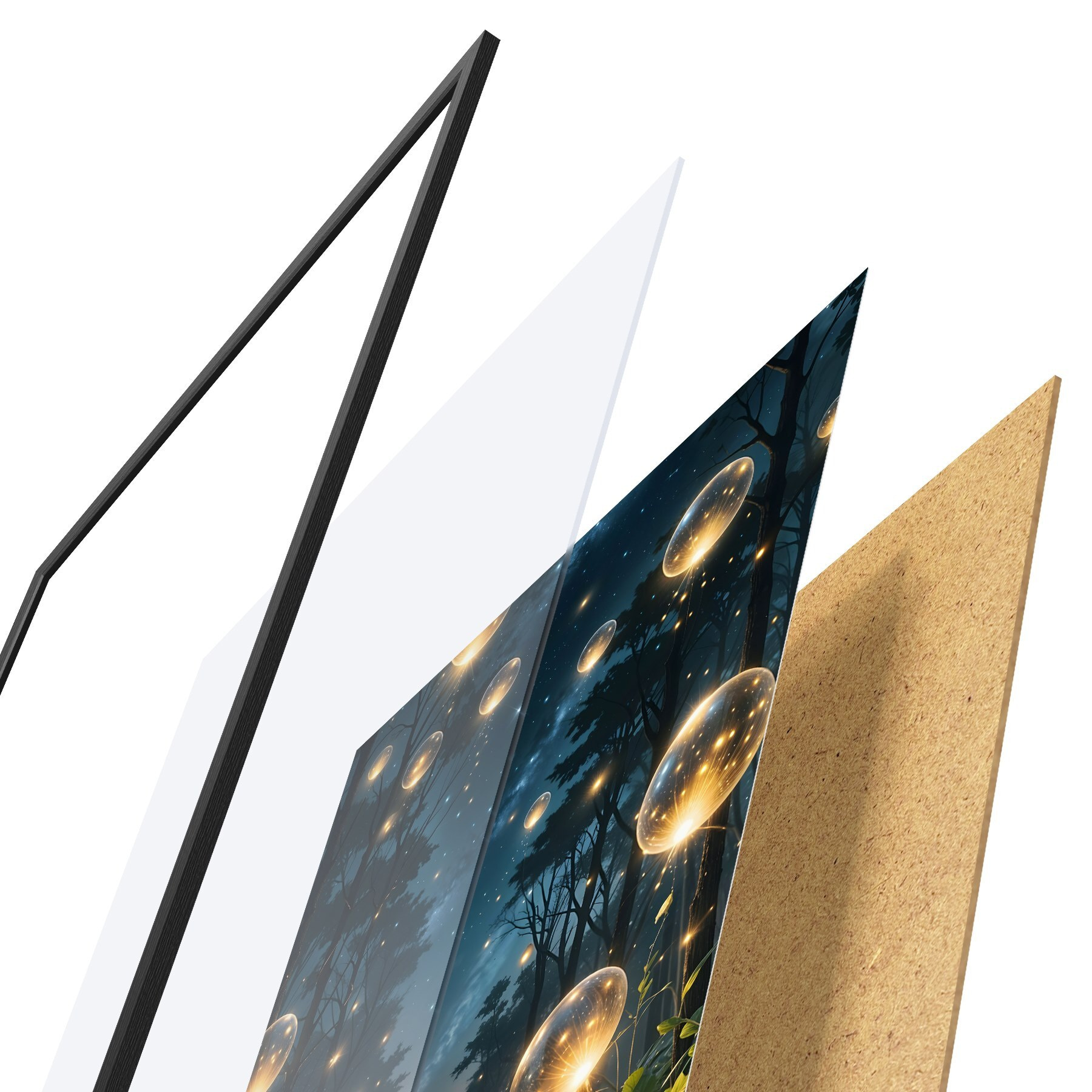 Plakatas Stebuklingas naktinis miškas su geltonais rutuliukais ir tarp medžių plūduriuojančiomis švieselėmis, kuriančiomis nuotaikingą atmosferą f41259