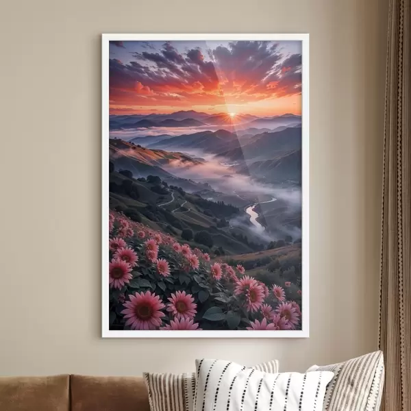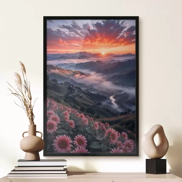 Plakatas Kvapą gniaužiantis kraštovaizdis su ryškiu saulėlydžiu virš kalnuoto regiono su rausvų gėlių kekėmis Ne f41263