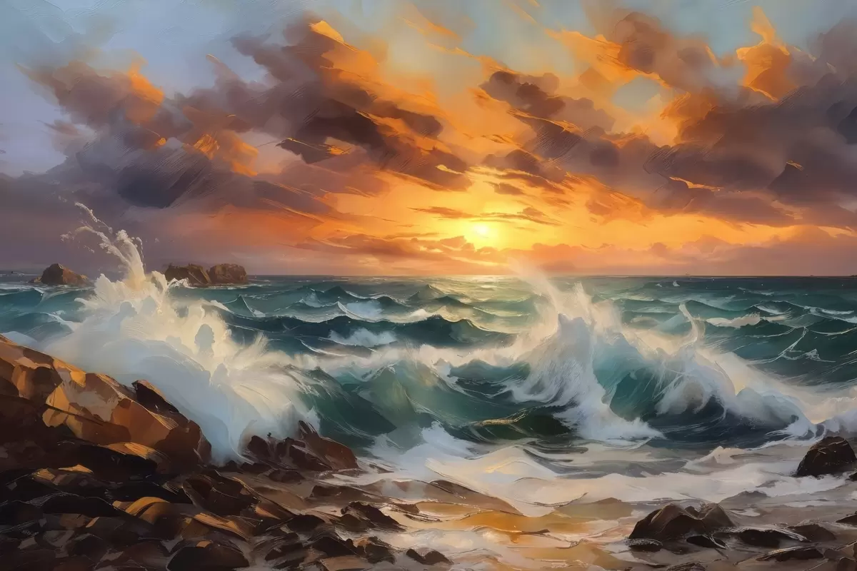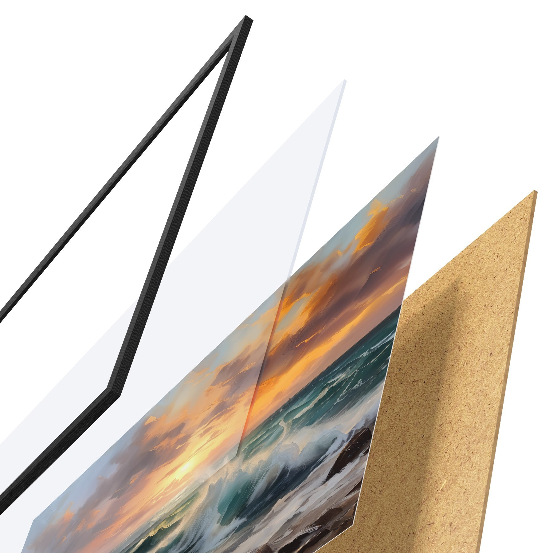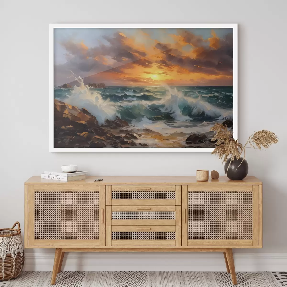 Plakatas Dramatiškas jūros peizažas su griaudžiančiomis bangomis ir uolomis, ryškiai oranžinės ir geltonos spalvos saulėlydžio dangus su debesimis f41266