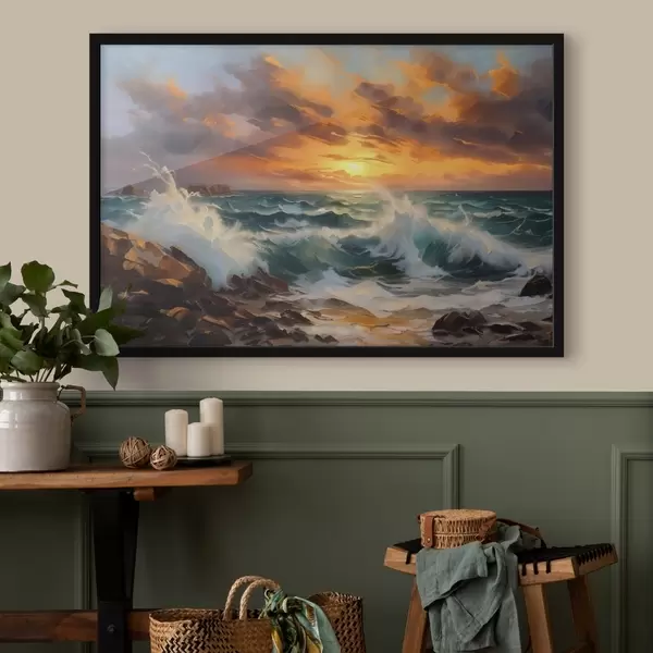 Plakatas Dramatiškas jūros peizažas su griaudžiančiomis bangomis ir uolomis, ryškiai oranžinės ir geltonos spalvos saulėlydžio dangus su debesimis Ne f41266