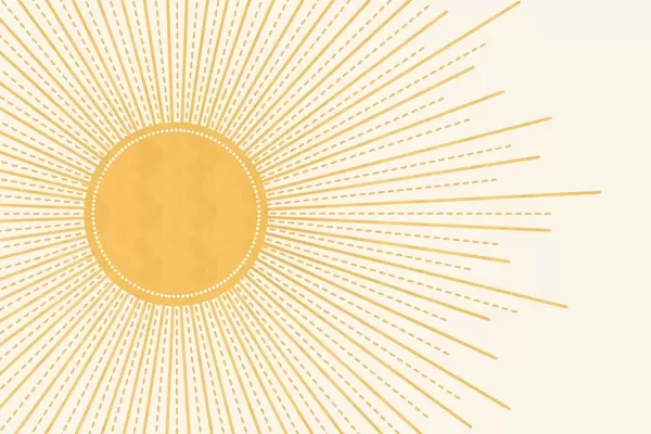 Plakatas Ryškiai geltona saulė su sklindančiais saulės spinduliais šviesiame fone, sukurianti šiltą ir saulėtą atmosferą f41268