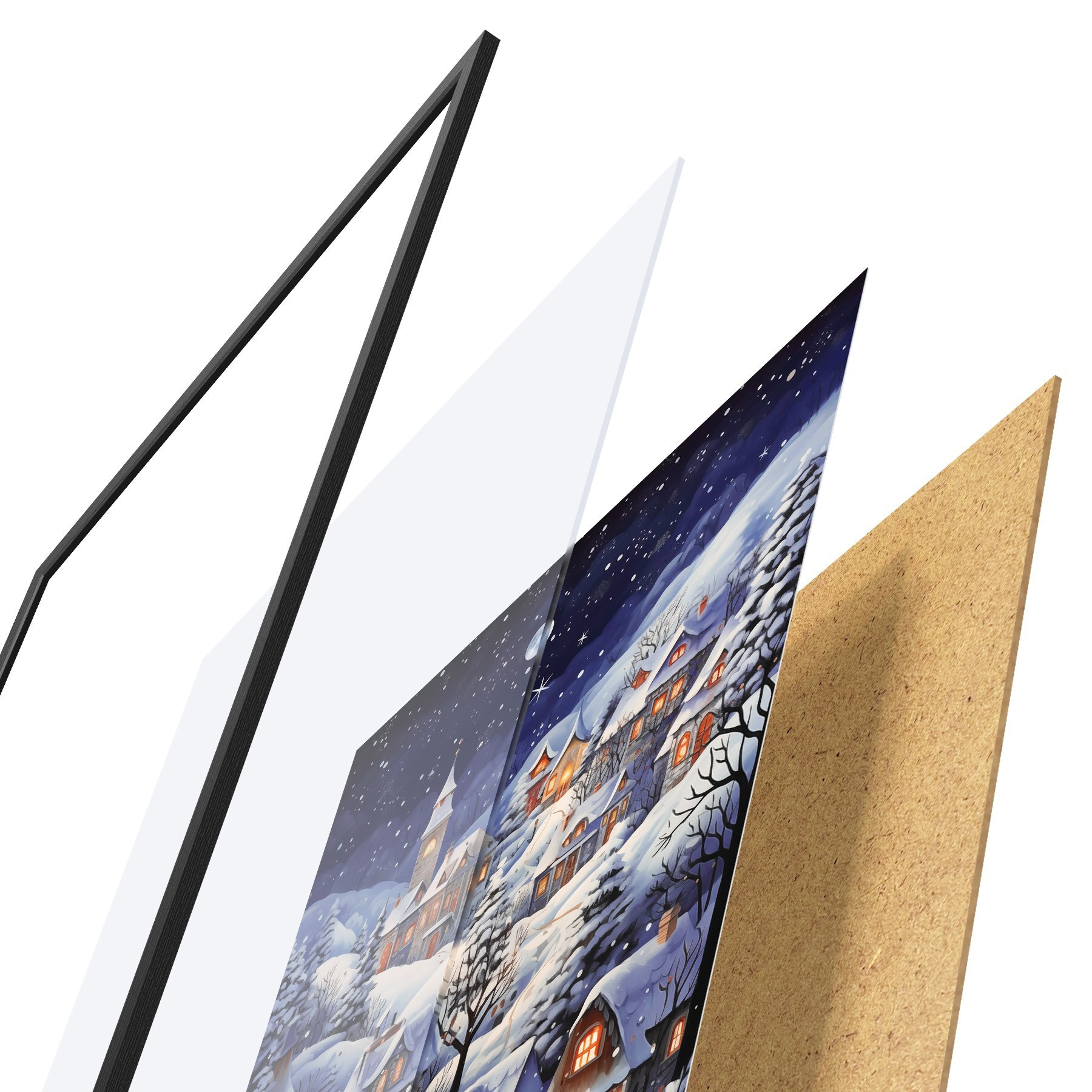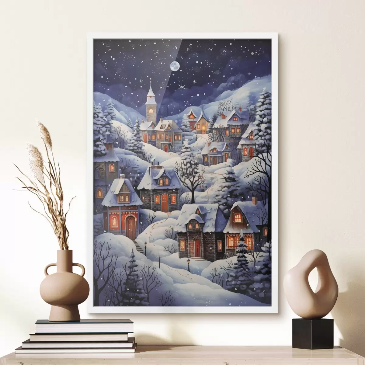 Plakatas Žiemos kraštovaizdis su apsnigtais kaimo namais nakties žvaigždėto dangaus fone f41275