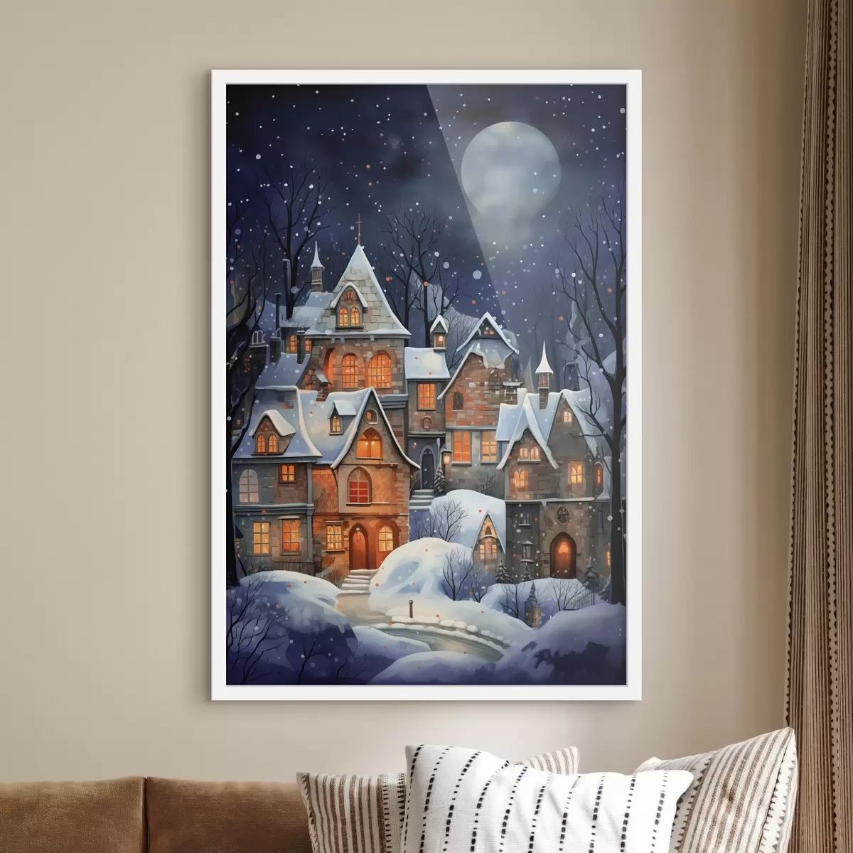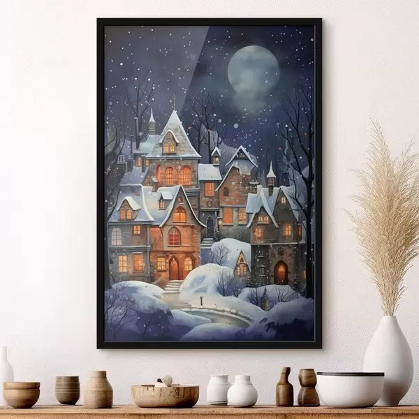Plakatas Namai sniege žvaigždėto nakties dangaus fone Ne f41276