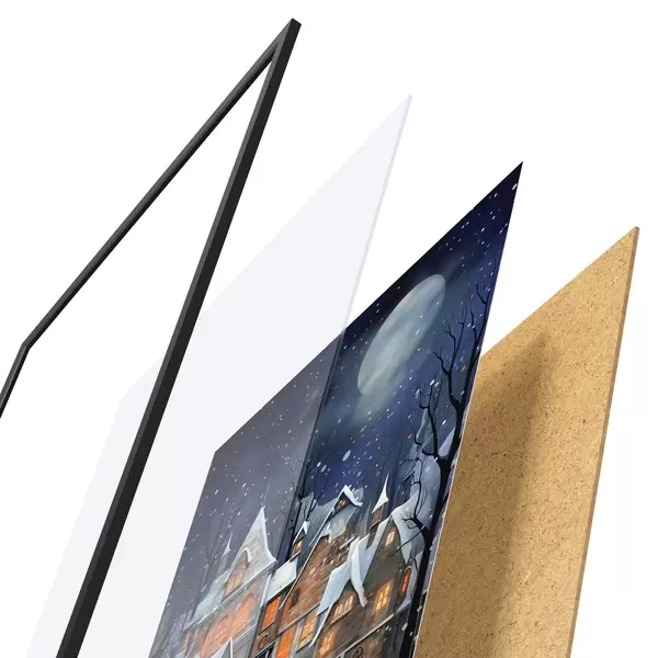 Plakatą sudaro rėmas, pleksiklas, atspausdintas vaizdas ir medžio drožlių plokštės pagrindas. Plakatą galima iš karto pakabinti ant sienos dėl kitoje pusėje esančių laikiklių.