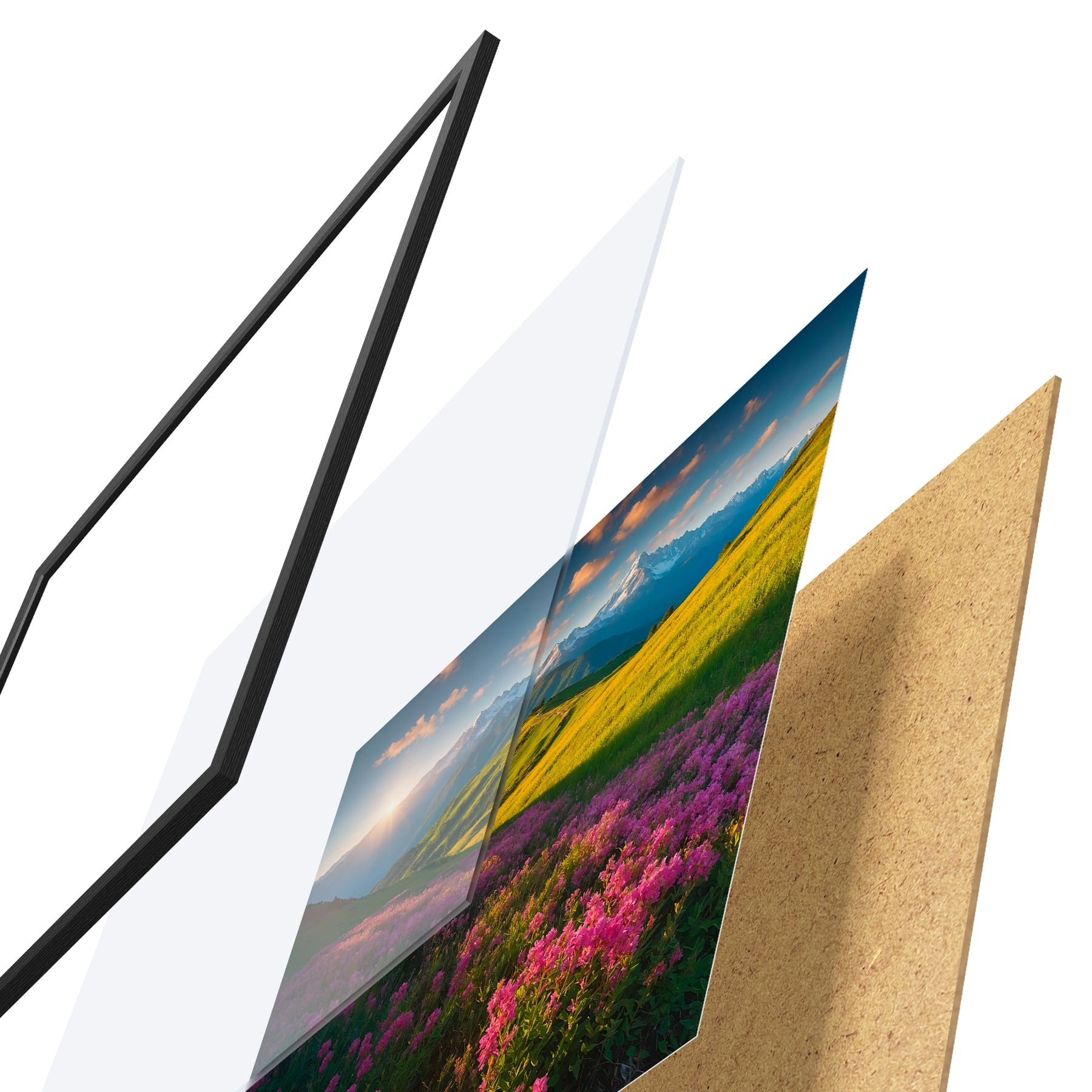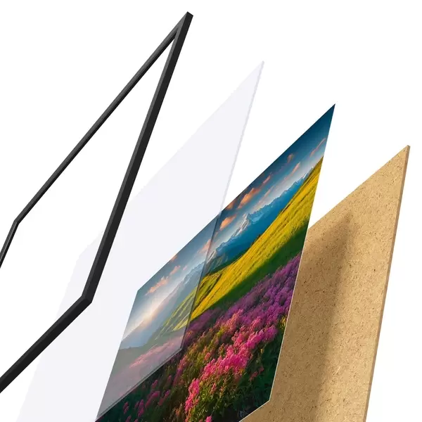 Plakatą sudaro rėmas, pleksiklas, atspausdintas vaizdas ir medžio drožlių plokštės pagrindas. Plakatą galima iš karto pakabinti ant sienos dėl kitoje pusėje esančių laikiklių.