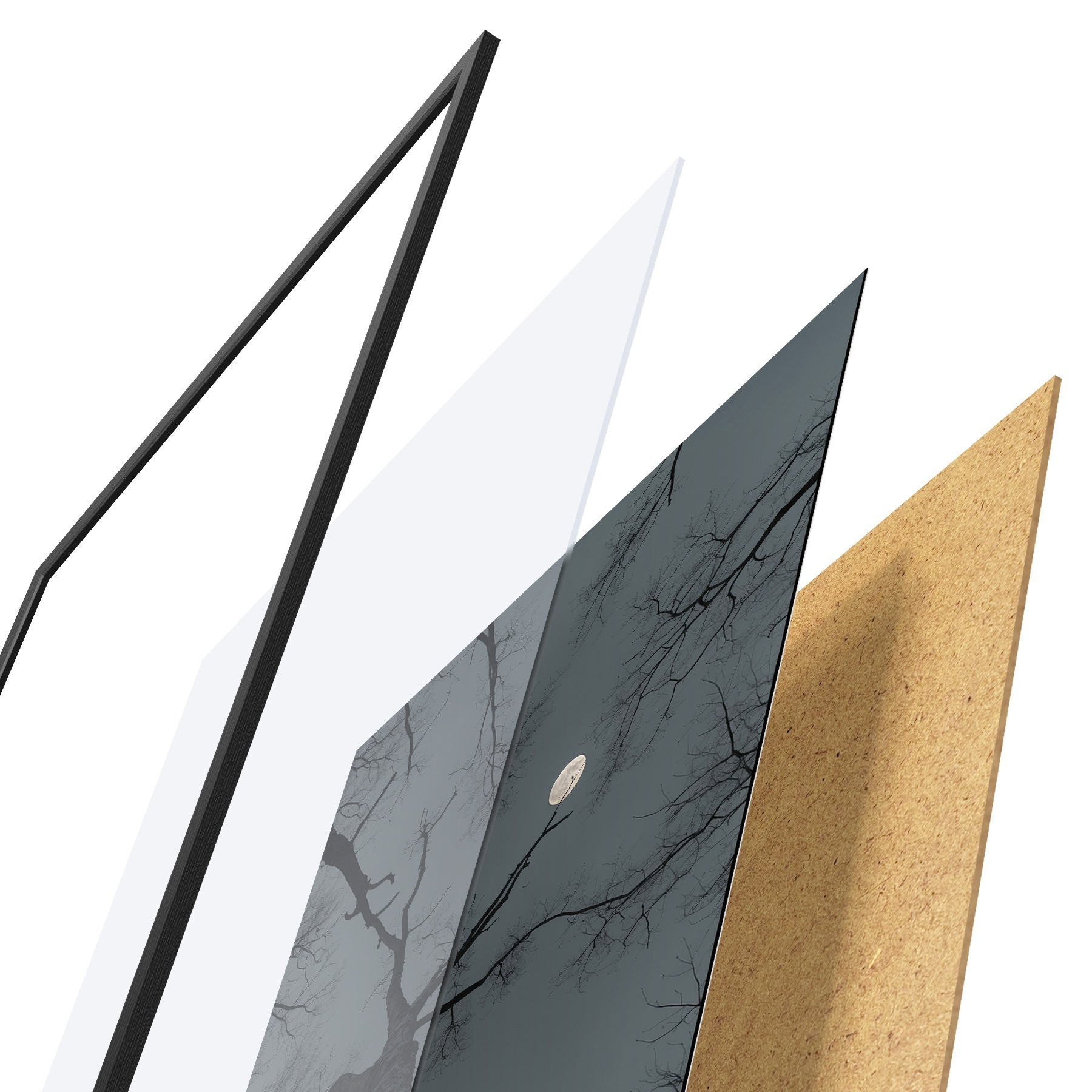 Plakatą sudaro rėmas, pleksiklas, atspausdintas vaizdas ir medžio drožlių plokštės pagrindas. Plakatą galima iš karto pakabinti ant sienos dėl kitoje pusėje esančių laikiklių.