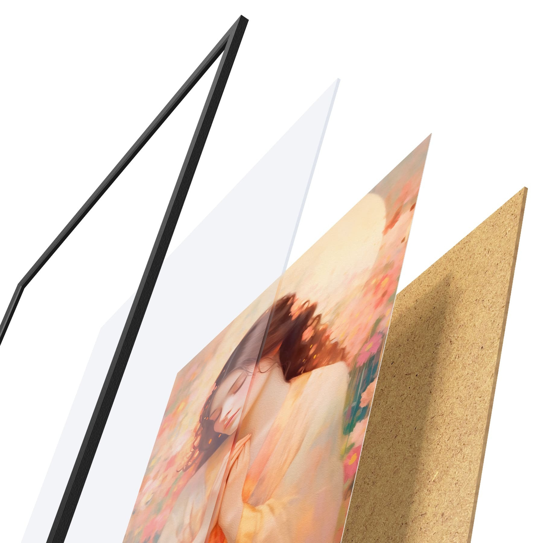 Plakatą sudaro rėmas, pleksiklas, atspausdintas vaizdas ir medžio drožlių plokštės pagrindas. Plakatą galima iš karto pakabinti ant sienos dėl kitoje pusėje esančių laikiklių.