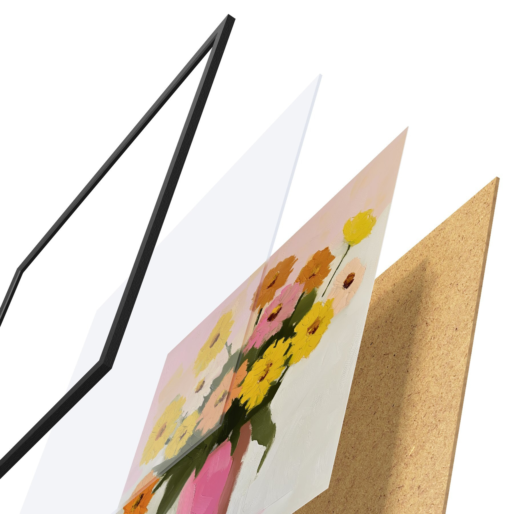 Plakatą sudaro rėmas, pleksiklas, atspausdintas vaizdas ir medžio drožlių plokštės pagrindas. Plakatą galima iš karto pakabinti ant sienos dėl kitoje pusėje esančių laikiklių.