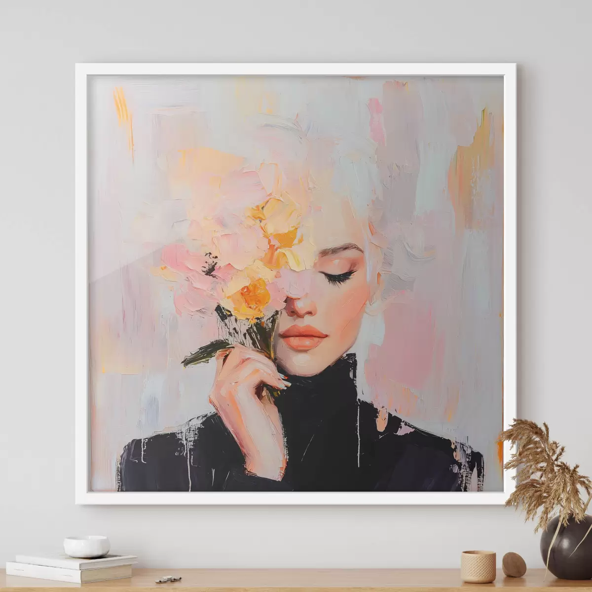 Plakatas Abstrakti moteris su gėlių puokšte rankose su teptuko potėpiais Ne f41355