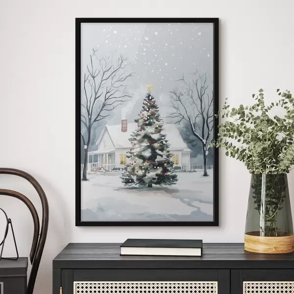 Plakatas Žiemos miestelis, papuošta pušis, Kalėdos, akvarelė Ne f41364