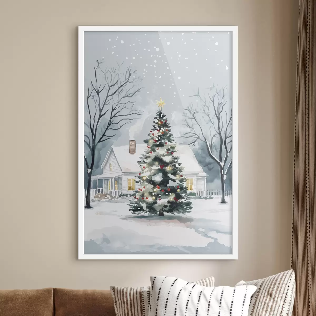 Plakatas Žiemos miestelis, papuošta pušis, Kalėdos, akvarelė f41364