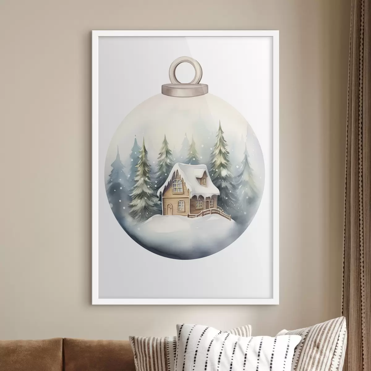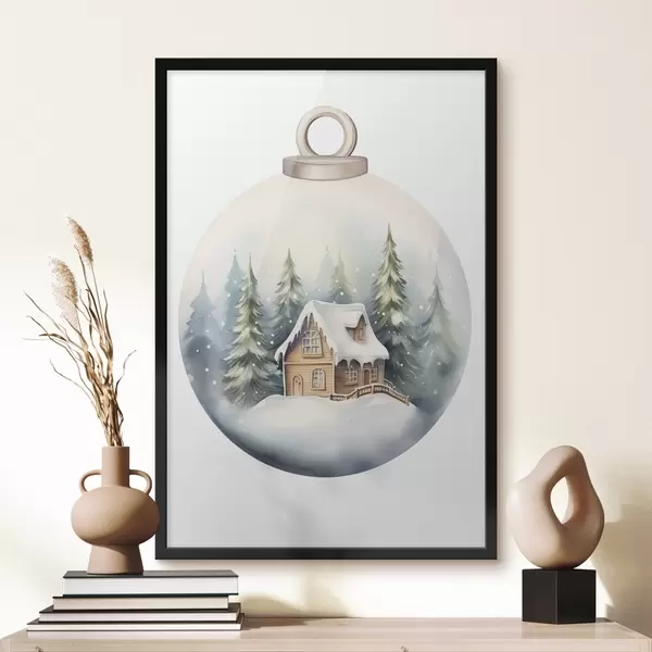 Plakatas Akvarelinis krištolinis rutulys su žiemos scenomis, namas miške, sniegas f41366