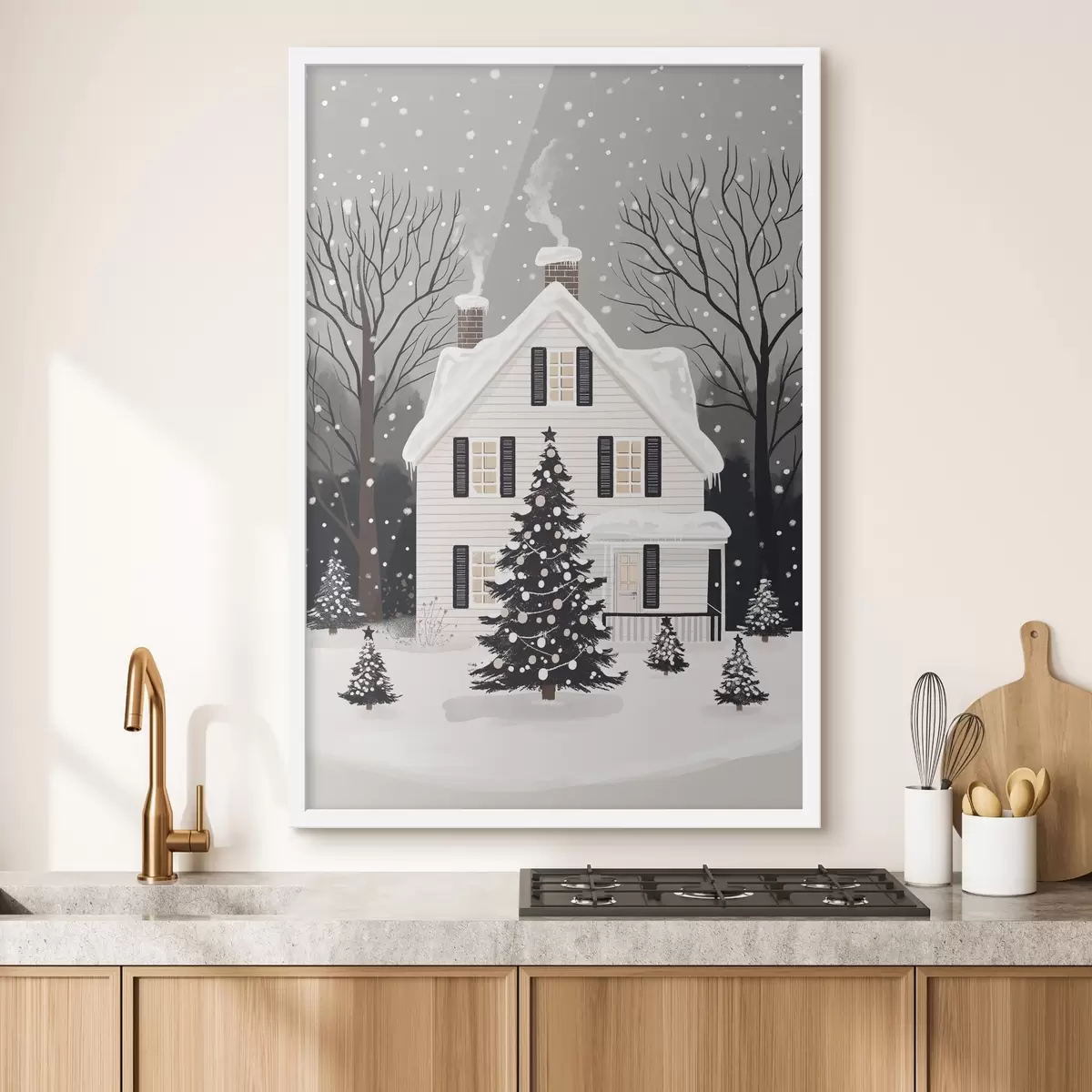 Plakatas Žiemos miestas, papuošta pušis, Kalėdos, miškas, gražus namas f41371