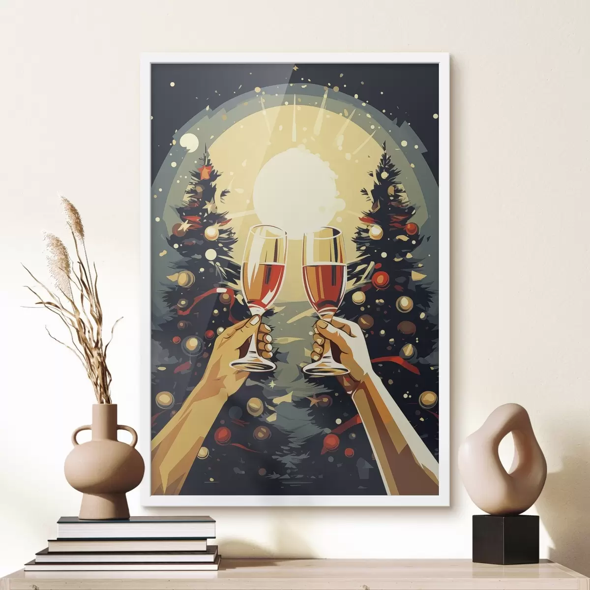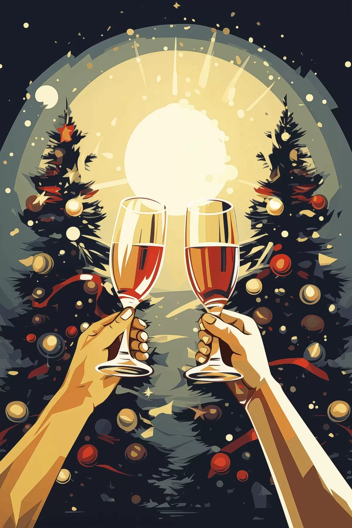 Plakatas Taurės su šampanu, Kalėdos, Naujieji metai, abstrakcija, pop menas, pušys f41374