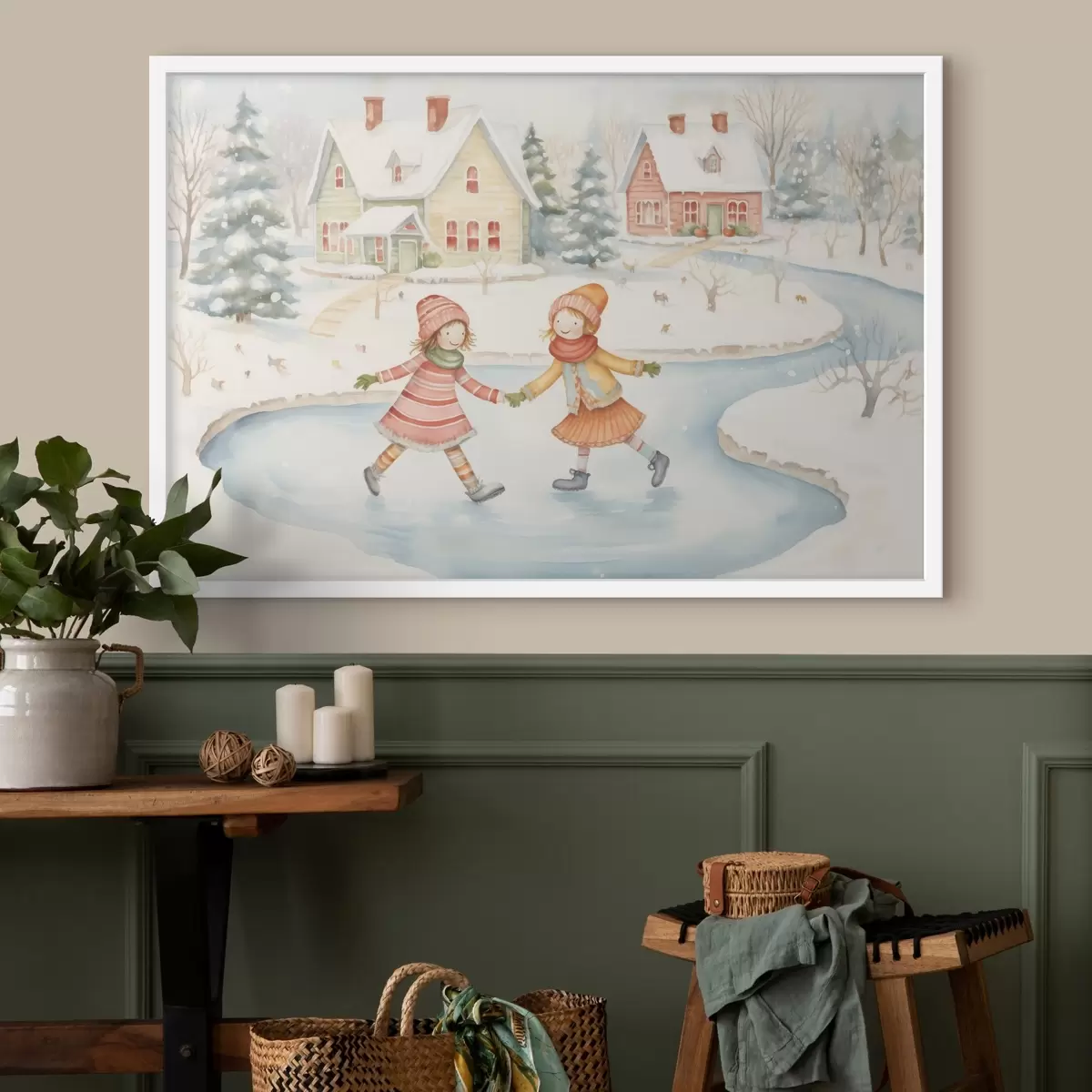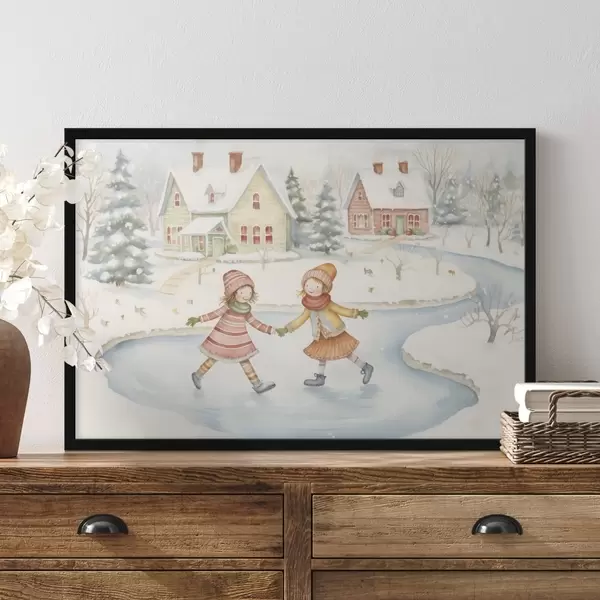 Plakatas Žiemos scena su dviem mergaitėmis, čiuožiančiomis ant ledo, žiemos miestas, namai, miškas f41377