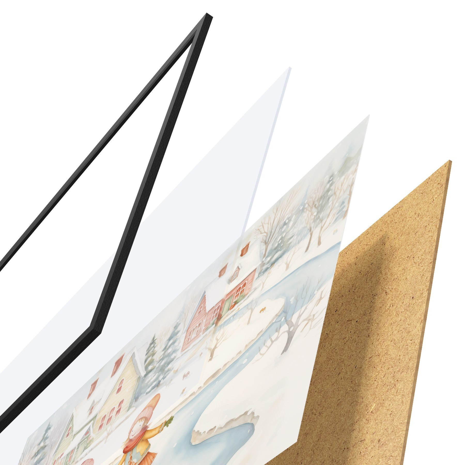 Plakatas Žiemos scena su dviem mergaitėmis, čiuožiančiomis ant ledo, žiemos miestas, namai, miškas Ne f41377