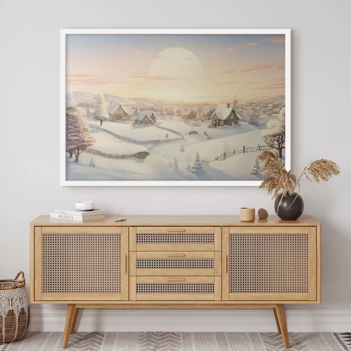 Plakatas Žiemos kaimas saulėlydyje, sniegu padengti namai, pušys Ne f41380