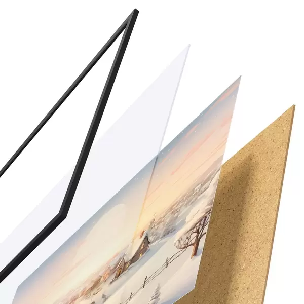 Plakatą sudaro rėmas, pleksiklas, atspausdintas vaizdas ir medžio drožlių plokštės pagrindas. Plakatą galima iš karto pakabinti ant sienos dėl kitoje pusėje esančių laikiklių.