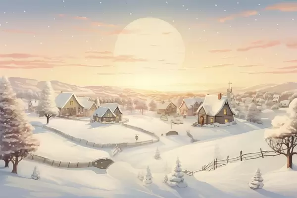 Plakatas Žiemos kaimas saulėlydyje, sniegu padengti namai, pušys Ne f41380