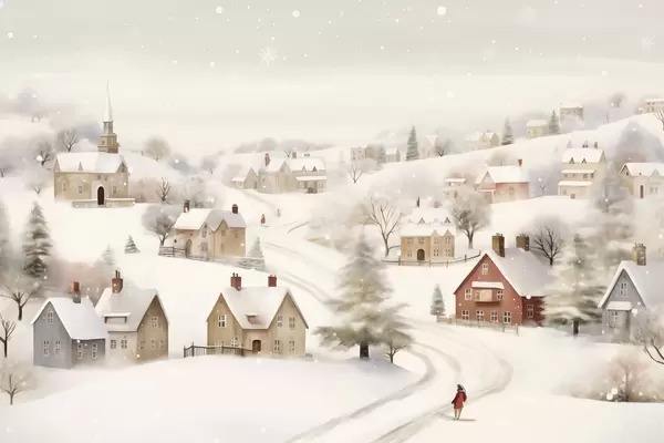Plakatas Žiemos kaimas, akvarelė, snaigės, švelnios spalvos, medžiai, peizažas f41381
