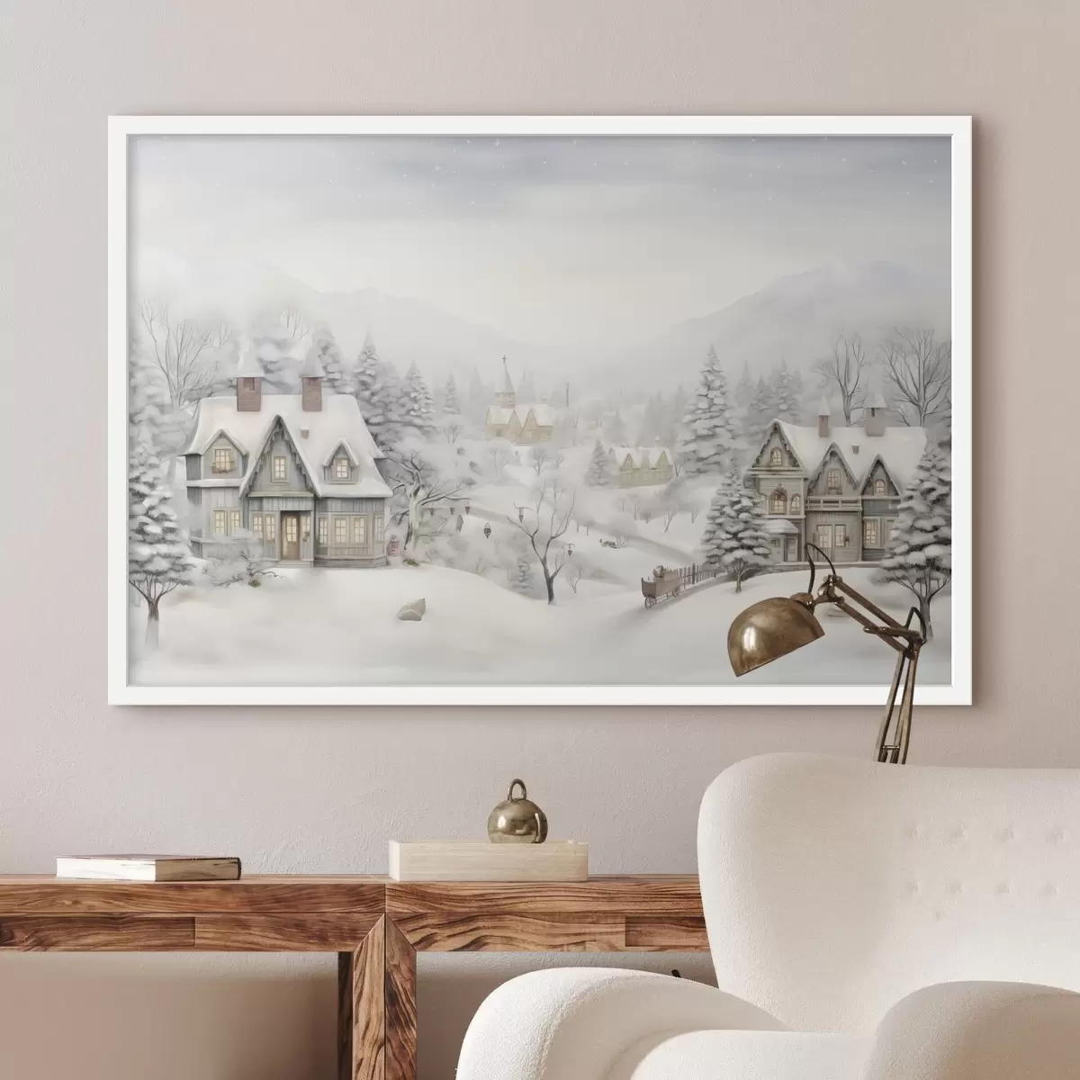Plakatas Gražus žiemos kraštovaizdis su kaimu, pušimis, namais, kalnais f41384
