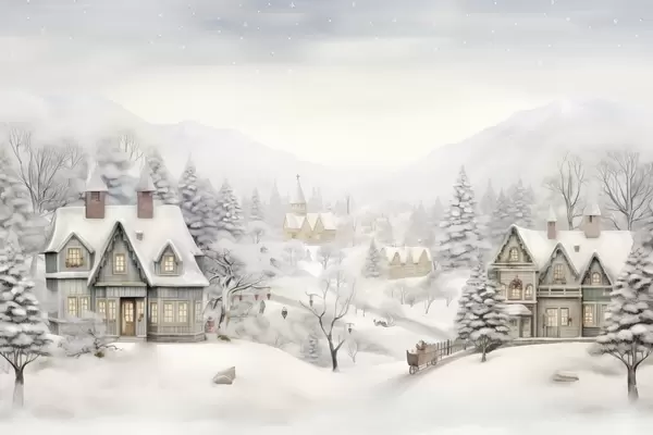 Plakatas Gražus žiemos kraštovaizdis su kaimu, pušimis, namais, kalnais f41384