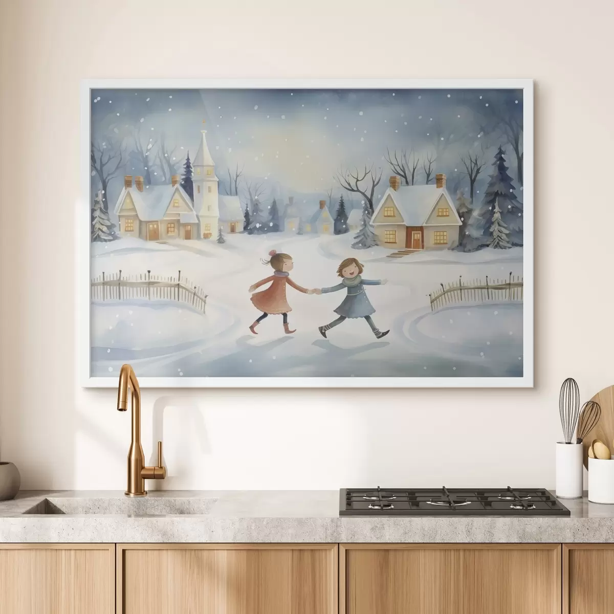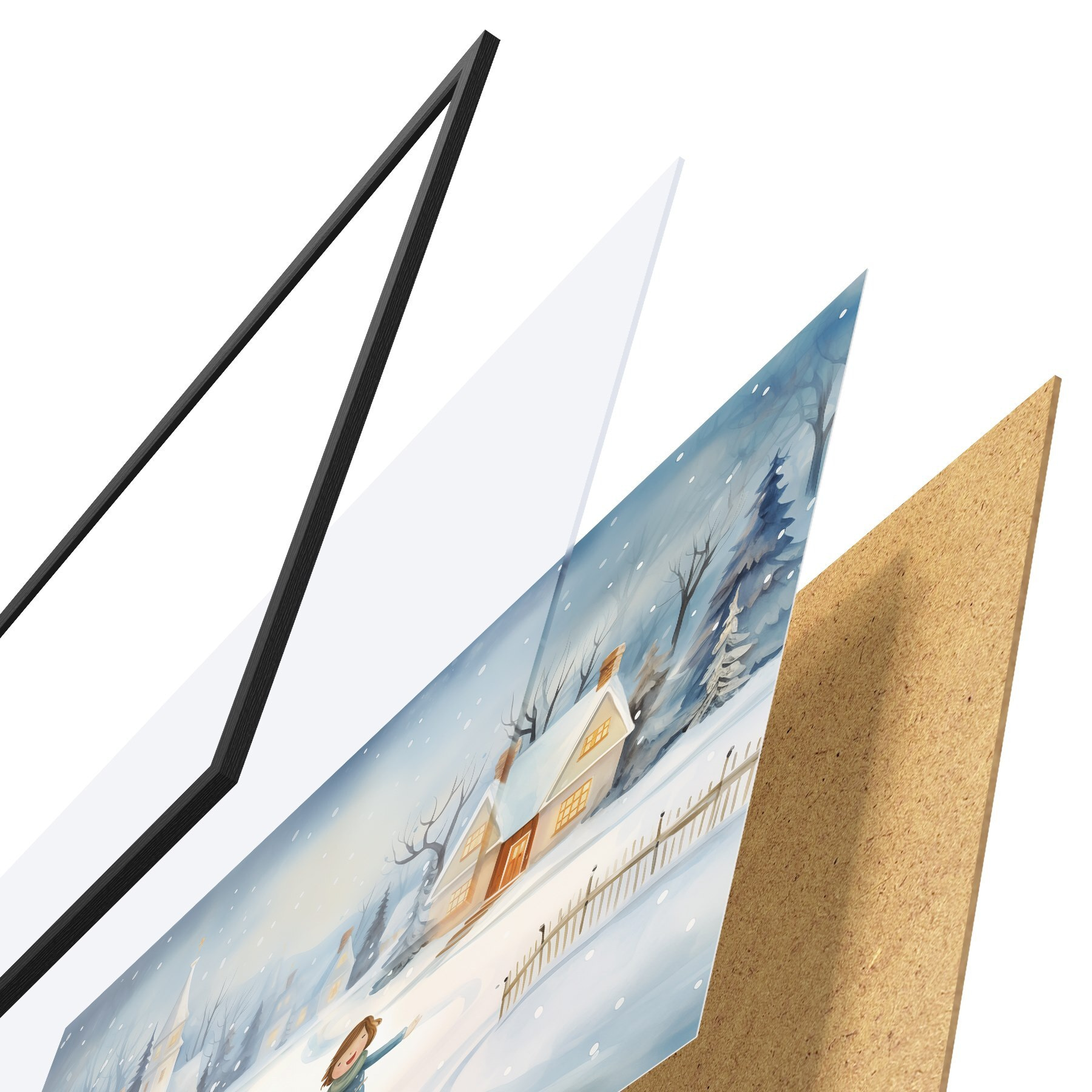 Plakatas Mergaitės žiemos kaime, snaigės, akvarelė, namai, miškas f41385