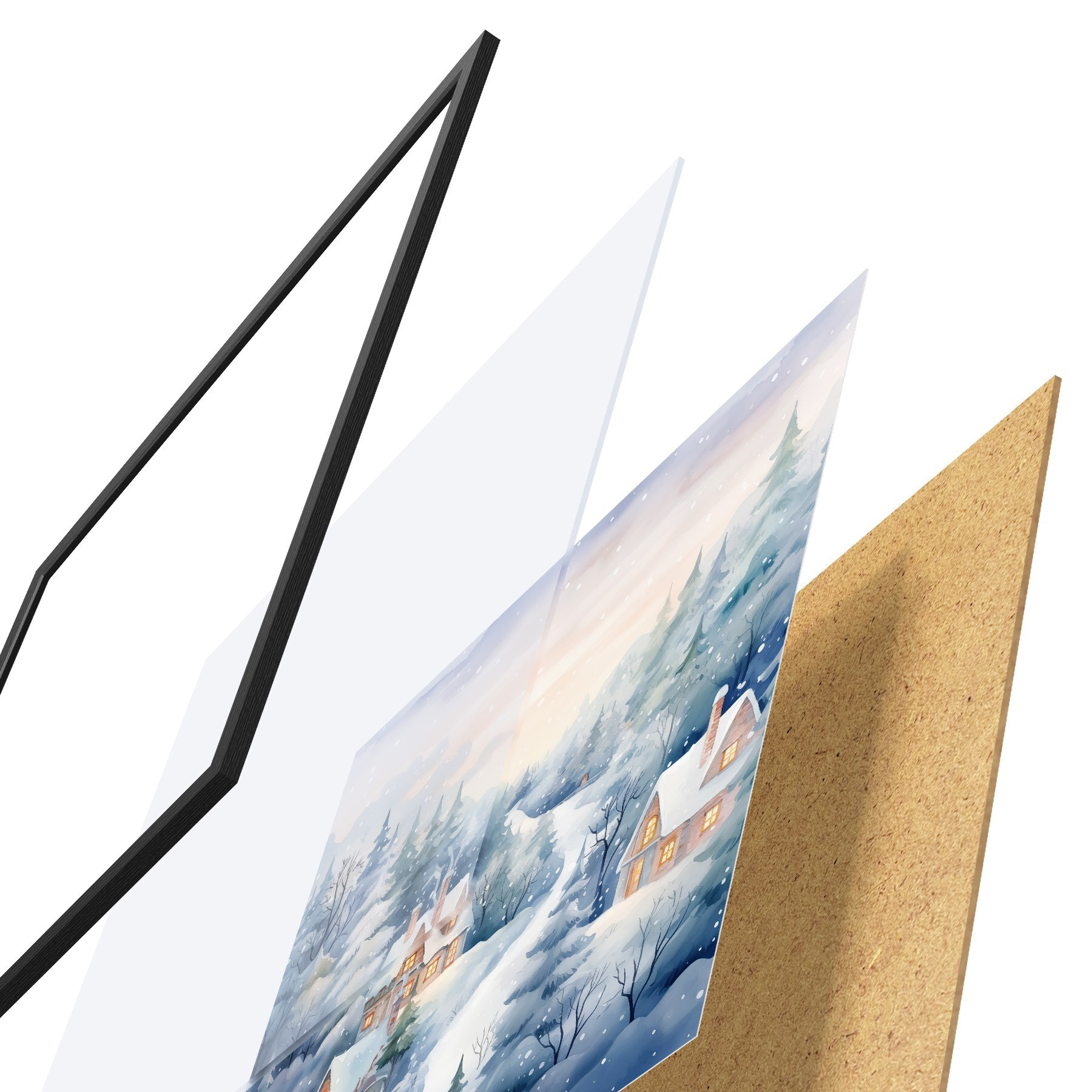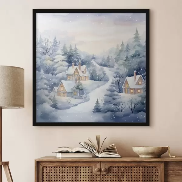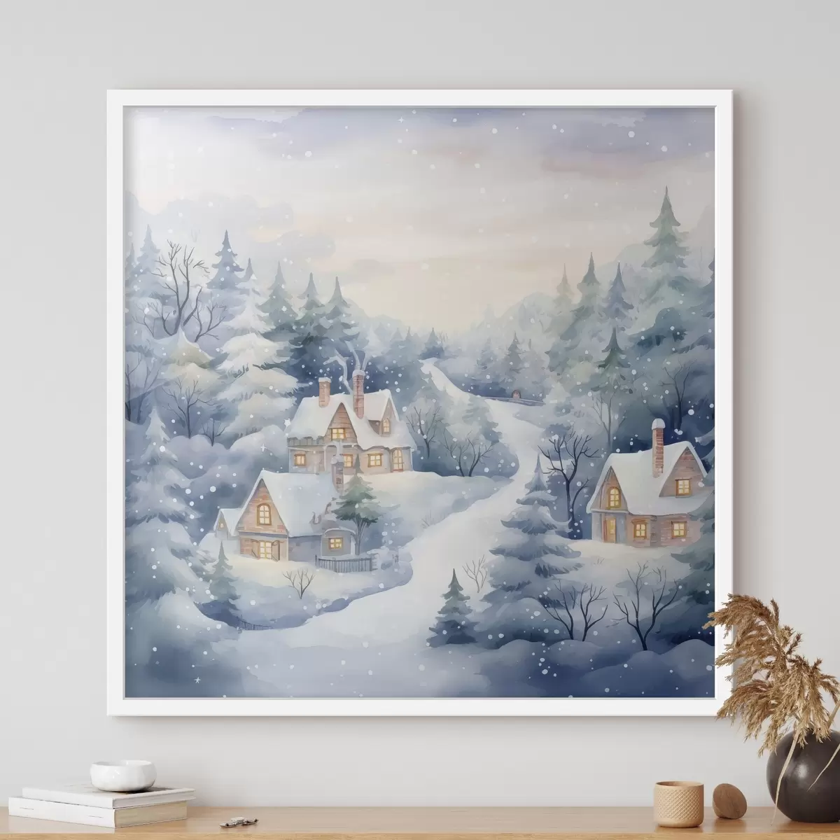 Plakatas Akvarelė žiemos peizažas, pušynas, namai f41387